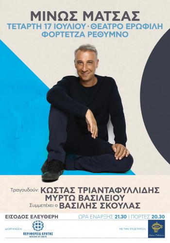 Ο βραβευμένος συνθέτης Μίνως Μάτσας έρχεται στις 17 Ιουλίου 2024 για μια μοναδική συναυλία στο Δημοτικό Θέατρο Ερωφίλη στο Ρέθυμνο, σε διοργάνωση της Περιφέρειας Κρήτης και με την υποστήριξη του Δήμου Ρεθύμνης.