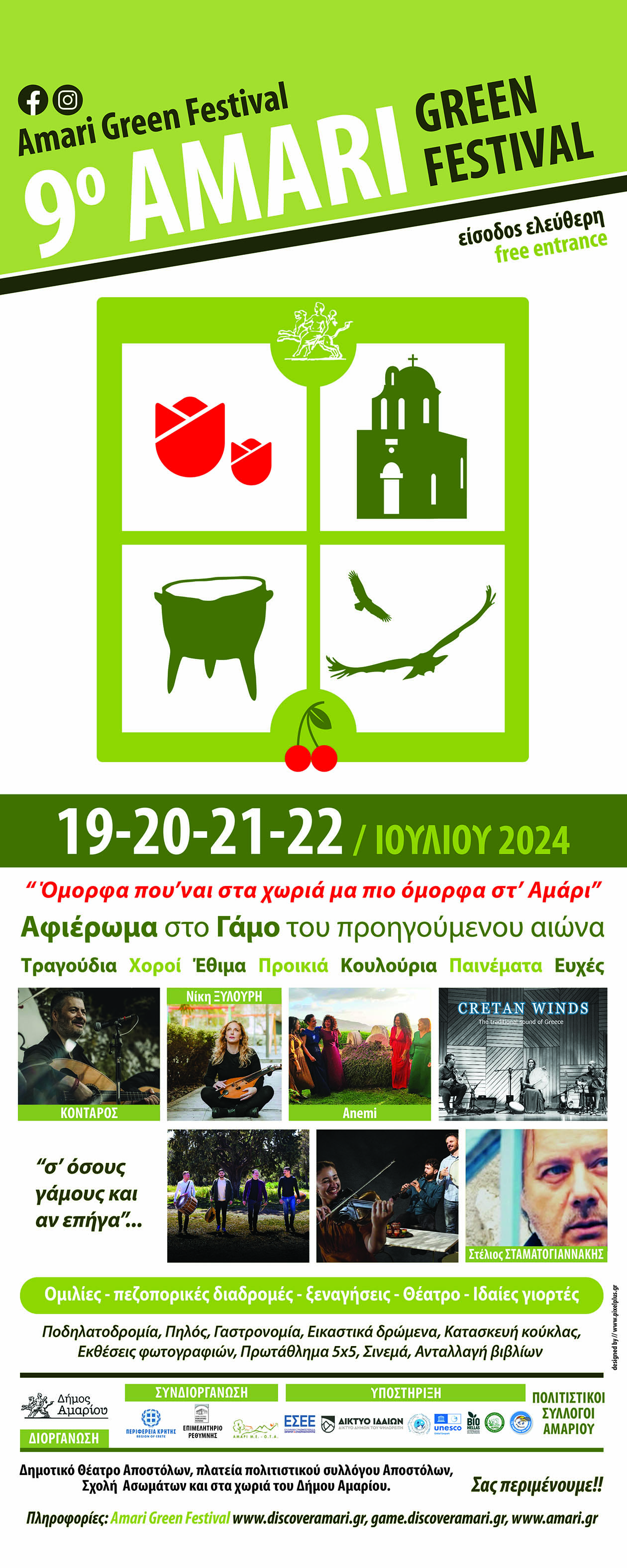 Μια μεγάλη γιορτή ετοιμάζει και φέτος ο Δήμος Αμαρίου Ρεθύμνης, ένας από τους μικρούς ορεινούς Δήμους της Κρήτης, σε συνεργασία με τους Πολιτιστικούς Συλλόγους των μικρών χωριών του. Το 9ο Amari Green Festival, που θα διεξαχθεί από τις 19 έως τις 22 Ιουλίου 2024, περιλαμβάνει ένα πλούσιο πρόγραμμα 49 εκδηλώσεων που προάγει την πολιτιστική κληρονομιά, την κυκλική οικονομία και την αειφόρο ανάπτυξη.