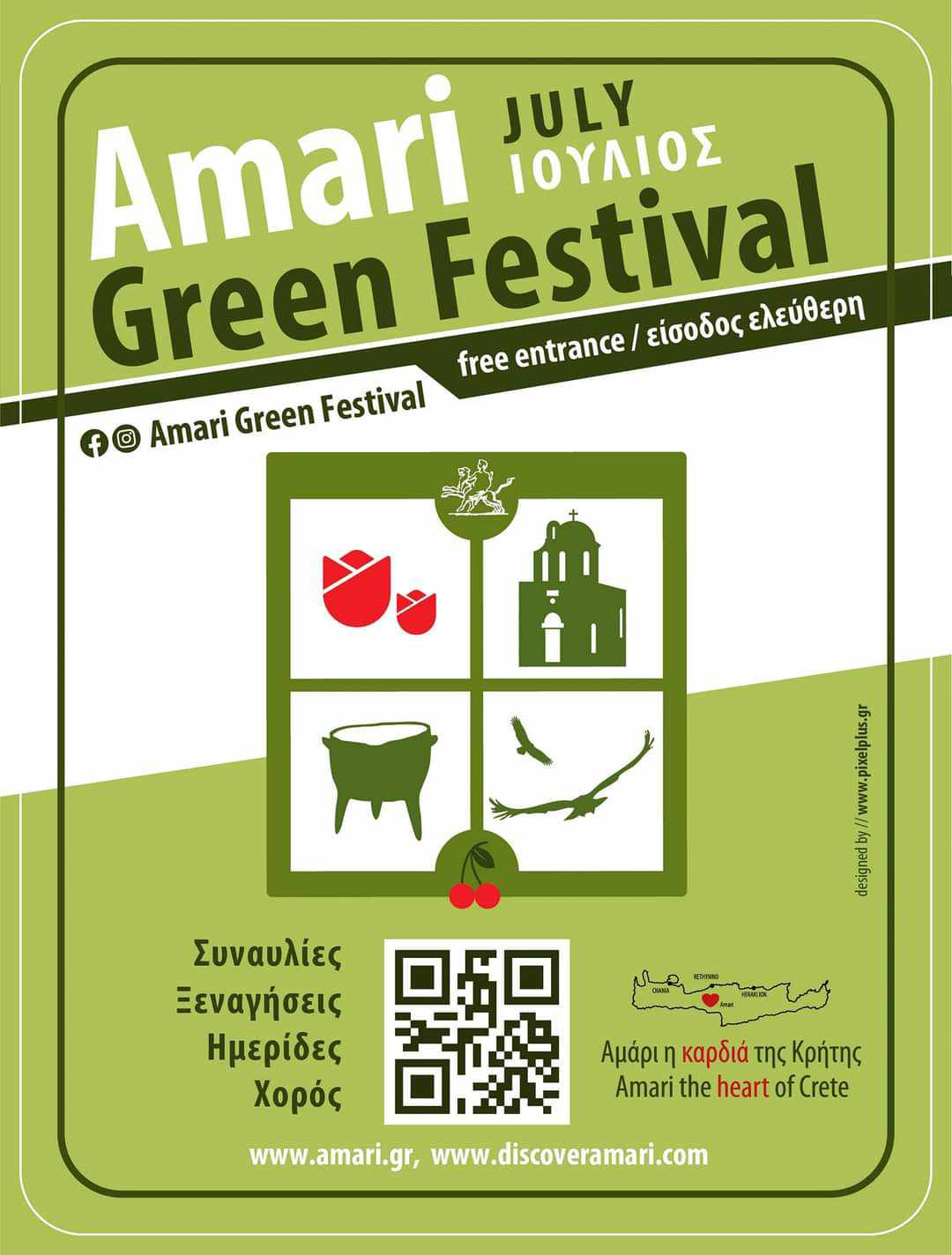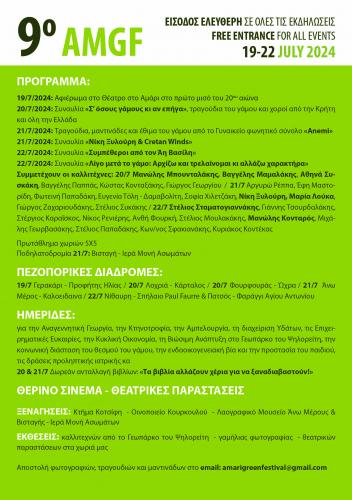 Το 9ο Amari Green Festival υπόσχεται τέσσερις ημέρες γεμάτες δράσεις, πολιτισμό και διασκέδαση. Σε συνεργασία με πάνω από δεκαπέντε Πολιτιστικούς Συλλόγους, καλλιτέχνες, μουσικούς, χορευτές, επιστήμονες και εθελοντές, το φεστιβάλ συμβάλλει στην προώθηση της τοπικής κουλτούρας και της αειφόρου ανάπτυξης. Σας περιμένουμε όλους να ζήσουμε μαζί αυτή τη μοναδική εμπειρία!