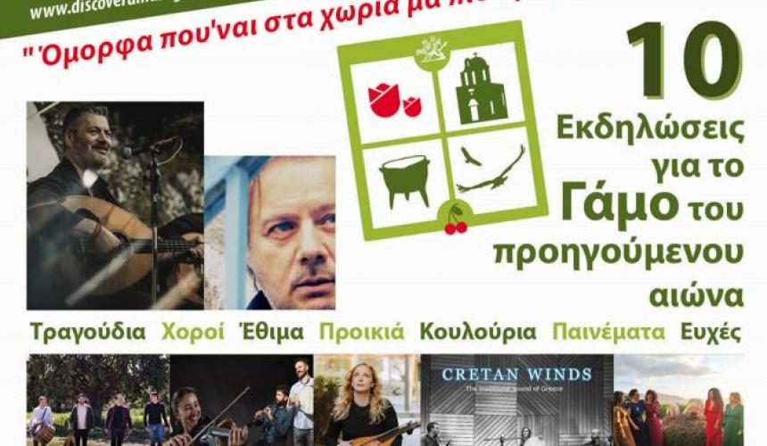 Οι εκδηλώσεις περιλαμβάνουν πεζοπορικές διαδρομές, ενημερωτικές ομιλίες, μουσικές και θεατρικές παραστάσεις, εργαστήρια κατασκευής παραδοσιακής κούκλας και πηλού, εκθέσεις, προβολές ταινιών και πρωταθλήματος 5Χ5 μεταξύ των χωριών. Μια από τις κεντρικές θεματικές του φεστιβάλ είναι ο κρητικός γάμος, με πολλές εκδηλώσεις αφιερωμένες στα έθιμα και τις παραδόσεις του.