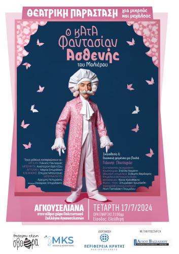 Η παράσταση θα παρουσιαστεί στα Αγκουσελιανά του Δήμου Αγ. Βασιλείου Ρεθύμνου την Τετάρτη 17 Ιουλίου 2024 και ώρα έναρξης 21:00 με ελεύθερη είσοδο και την υποστήριξη του Δήμου Αγίου Βασιλείου.
