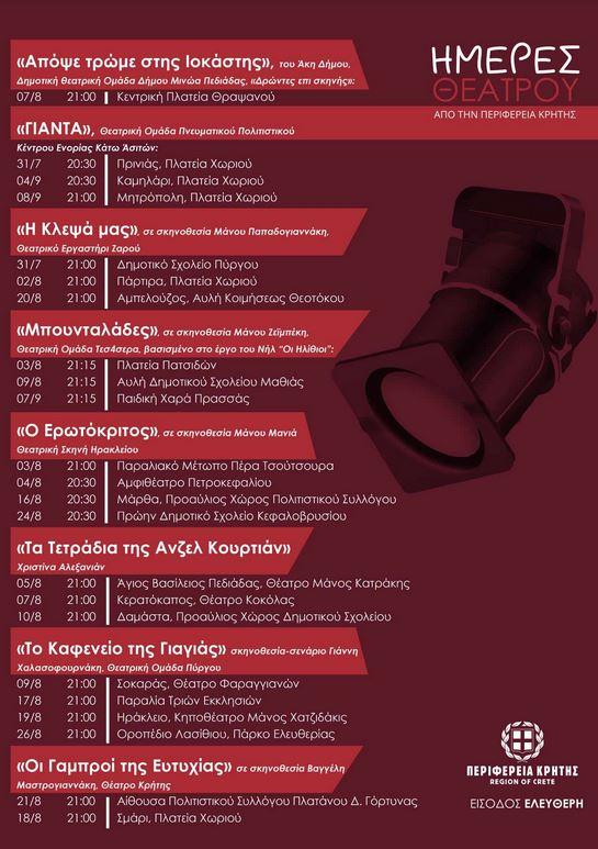 Η Περιφέρεια Κρήτης, επενδύοντας στις τέχνες και τον πολιτισμό, διοργανώνει σειρά θεατρικών παραστάσεων στην ενδοχώρα του νησιού προσβλέποντας στην ενίσχυση της απρόσκοπτης και ισότιμης πρόσβασης όλων των πολιτών στα πολιτιστικά αγαθά