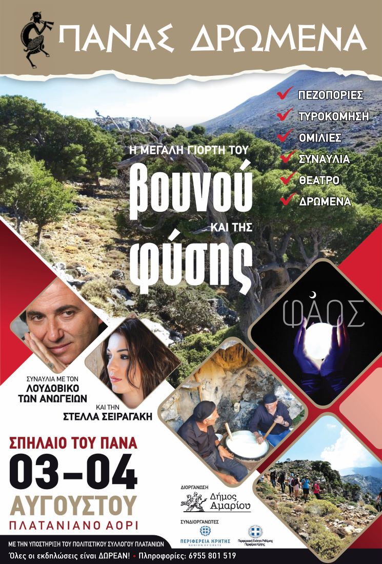 Ο Δήμος Αμαρίου σε συνεργασία με την Περιφέρεια Κρήτης και την Περιφερειακή Ενότητα Ρεθύμνου, με την υποστήριξη του Πολιτιστικού Συλλόγου Πλατανιών, διοργανώνει φέτος για τρίτη χρονιά τις εκδηλώσεις «Πάνας Δρώμενα» που θα λάβουν χώρα στις 3 και 4 Αυγούστου 2024 στον ορεινό όγκο του Ψηλορείτη, πάνω από τη Δημοτική Κοινότητα Πλατανιών, στο σπήλαιο "Πάνας".