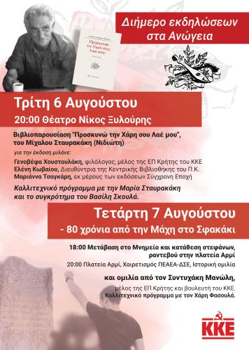 - Τρίτη 6/8 στις 20:00 στο Θέατρο «Νίκος Ξυλούρης». Βιβλιοπαρουσίαση «Προσκυνώ την χάρη σου λαέ μου», συλλογή ποιημάτων του Μιχάλη Σταυρακάκη (Νιδιώτη) από τις εκδόσεις της Σύγχρονης Εποχής.
