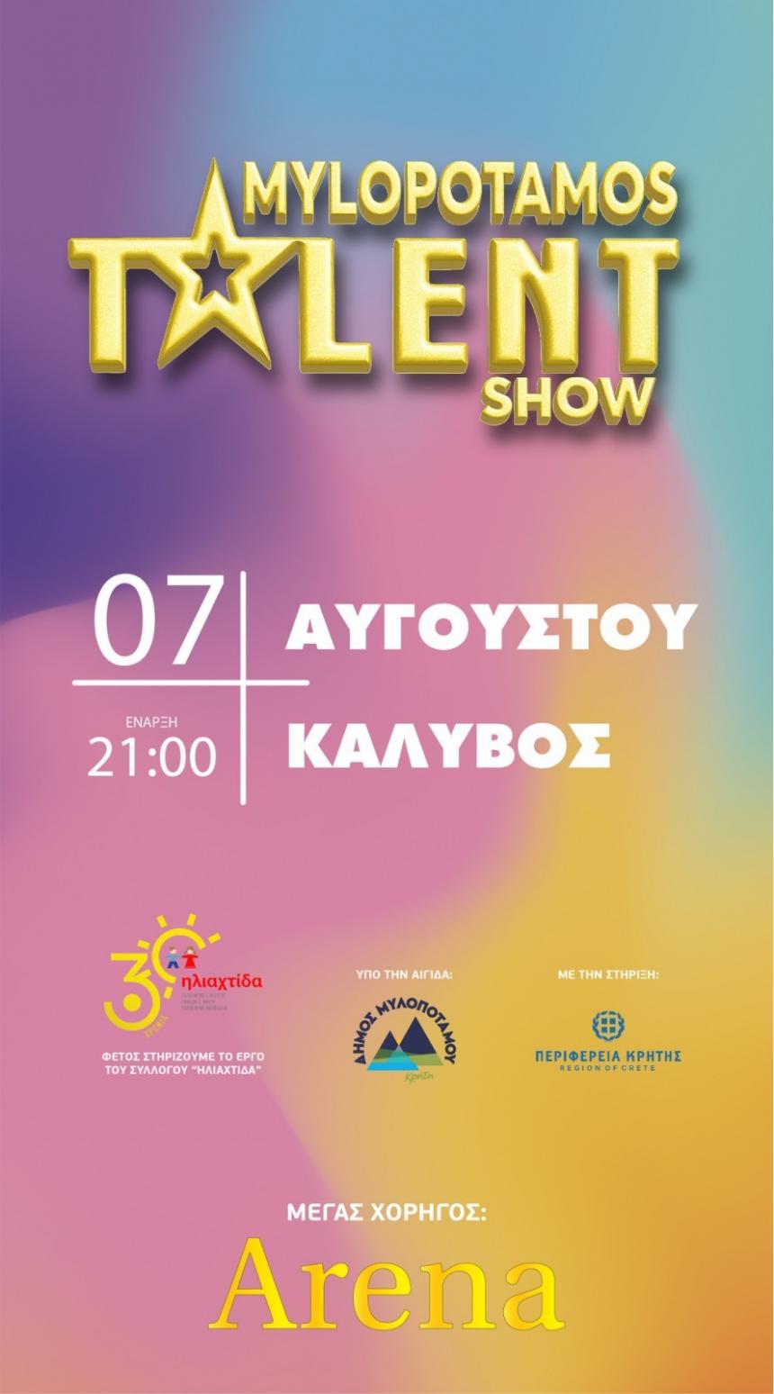 Η διοργάνωση «Mylopotamos Talents Show» που γίνεται με τη στήριξη της Περιφέρειας Κρήτης, σύμφωνα με τους διοργανωτές, είναι ο πιο κεφάτος και δημιουργικός διαγωνισμός για παιδιά στην Κρήτη που έρχεται να αλλάξει τα στερεότυπα, δίνοντας την ευκαιρία σε όλα τα παιδιά της περιοχής να αναδείξουν το ταλέντο τους.