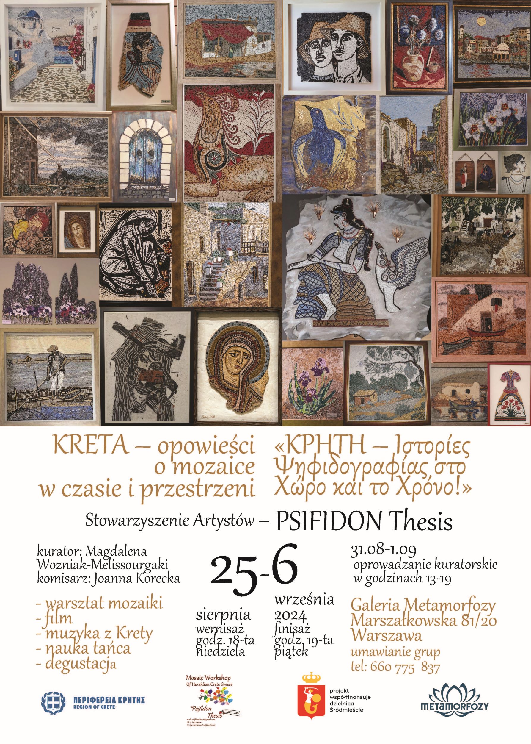 Ο Σύλλογος «ΨΗΦΙΔΩΝ Θέσις», μετά από πρόσκληση που δέχτηκε από το Δημοσίου Δικαίου Ίδρυμα FUNDACJA METAMORFOZY που εδρεύει στην Βαρσοβία, διοργανώνει με την υποστήριξη της Περιφέρειας Κρήτης, ομαδική έκθεση ψηφιδωτού από τις 25 Αυγούστου έως 6 Σεπτεμβρίου 2024 στην Gallery Metamorfozy (81 Marszalkowska St., Warsaw).