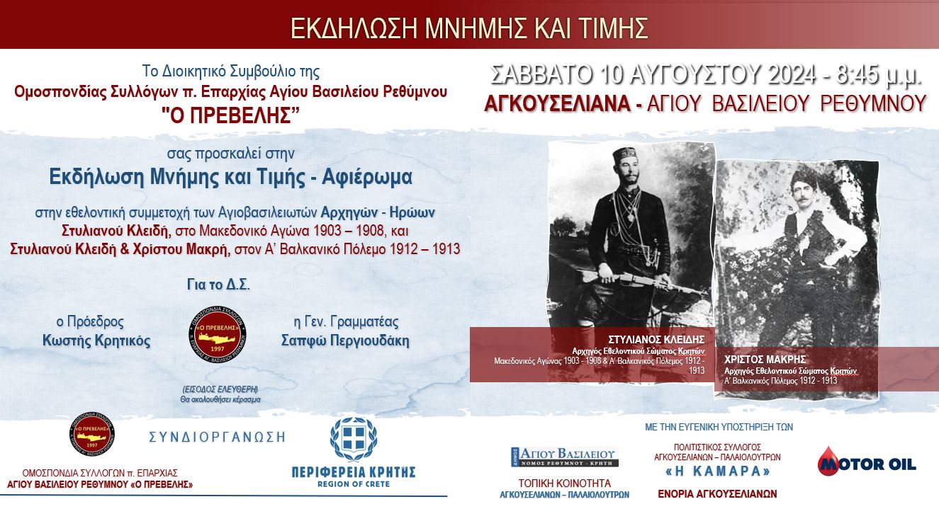 Σε συνέχεια της επιτυχημένης εκδήλωσης που πραγματοποιήθηκε στην Αθήνα προηγούμενο Απρίλιο, και μετά από ζήτηση πολλών συντοπιτών μας μονίμων κατοίκων Κρήτης, το Σάββατο 10 Αυγούστου 2024 πραγματοποιήθηκε η ΕΚΔΗΛΩΣΗ ΜΝΗΜΗΣ ΚΑΙ ΤΙΜΗΣ – Αφιέρωμα στην εθελοντική συμμετοχή των Αγιοβασιλειωτών Αρχηγών - Ηρώων