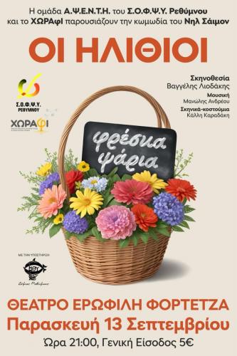Η θεατρική ομάδα Α.Ψ.Ε.Ν.Τ.Η (Από Ψυχής Εθελοντής Νέος τώρα Ηθοποιός) του Συλλόγου Οικογενειών και Φίλων για την Ψυχική Υγεία (Σ.Ο.Φ.Ψ.Υ) Ρεθύμνου και το ΧΩΡΑφΙ, με την υποστήριξη του Δήμου Ρεθύμνου παρουσιάζουν την κωμωδία του Νηλ Σάιμον «Οι Ηλίθιοι», την Παρασκευή 13 Σεπτεμβρίου 2024 στο θέατρο Ερωφίλη στην Φορτέτζα και ώρα 21.00