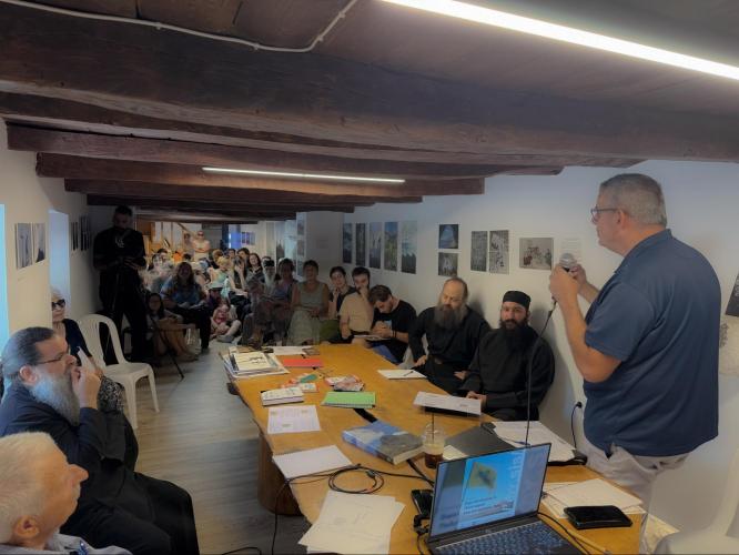 Αξιοσημείωτη ήταν η συμβολή του καθηγητή της Θεολογικής Σχολής Αθηνών, κ. Σωτηρίου Δεσπότη, ο οποίος με την εκτενή του γνώση και τη βαθιά θεολογική του σκέψη προσέφερε μια μοναδική προσέγγιση στη σύνδεση μεταξύ της Βίβλου και της σύγχρονης οικολογικής συνείδησης. Στις εισηγήσεις του, ο κ. Δεσπότης εστίασε στη βιβλική θεώρηση της Δημιουργίας και την ευθύνη του ανθρώπου ως φύλακα και κηδεμόνα της γης. Ανέλυσε το πώς οι Γραφές μπορούν να αποτελέσουν οδηγό για την περιβαλλοντική δράση, τονίζοντας ότι η οικολογία και η θεολογία δεν είναι δύο ξεχωριστά πεδία, αλλά άρρηκτα συνδεδεμένα, με τη φροντίδα για τη φύση να αποτελεί ουσιαστική έκφραση τής χριστιανικής πίστης. Ο λόγος του κ. Δεσπότη συνέβαλε ουσιαστικά στη διαμόρφωση ενός θεολογικού πλαισίου, το οποίο ενθάρρυνε τους συμμετέχοντες να αναλάβουν δράση για την προστασία του περιβάλλοντος, ενσωματώνοντας τις βιβλικές αξίες στην καθημερινή ζωή, την κοινωνική τους δραστηριότητα και το καλλιτεχνικό τους έργο. Παράλληλα, μέσω των βιωματικών δραστηριοτήτων και των καλλιτεχνικών εργαστηρίων ζωγραφικής, κεραμικής και αρχιτεκτονικής, τα οποία υποστήριξαν οι κα. Ολυμπιάδα Κελαϊδή, κα. Ευαγγελία Κελαϊδή και κα. Φρόσω Ποιμενίδου, οι συμμετέχοντες εξερεύνησαν την εφαρμογή των βιβλικών αρχών στην καθημερινή ζωή και την καλλιτεχνική έκφραση, ενώ, αξίζει να σημειωθεί πως οι φοιτητές της Ανωτάτης Σχολής Καλών Τεχνών Αθηνών, χρησιμοποιώντας χώμα και ξύλα, κατασκεύασαν πήλινες κατασκευές και χειροποίητες φωλιές για τα μικρά ζώα του μοναστηριού. Η πρωτοβουλία αυτή όχι μόνο ενίσχυσε τη βιοποικιλότητα της περιοχής, αλλά έδωσε στους συμμετέχοντες την ευκαιρία να εφαρμόσουν μέσα σε ένα μοναδικό σε ομορφιά και ησυχία φυσικό και λατρευτικό περιβάλλον στην πράξη τις θεολογικές αρχές της φροντίδας για την Κτίση, εκπληρώνοντας έτσι τον ρόλο τους ως διαχειριστές της γης και φροντιστές των ζώων, όπως περιγράφεται στη Γένεση.