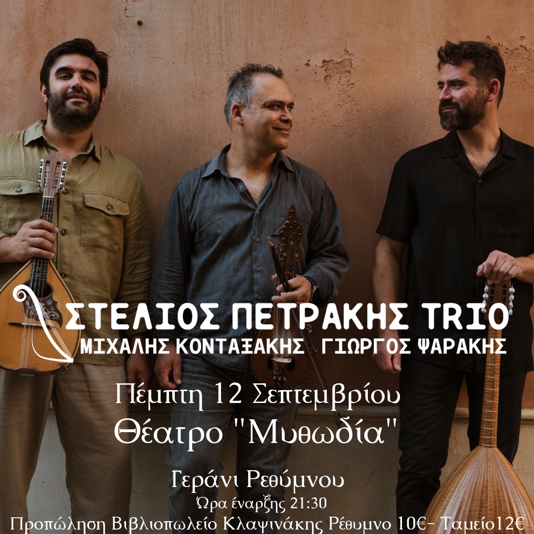 Την Πέμπτη 12 Σεπτέμβρη ο Στέλιος Πετράκης θα εμφανιστεί στο Θέατρο Μυθωδία στο Γεράνι Ρεθύμνου. Μαζί του οι Μιχάλης Κονταξάκης (μαντολίνο) και Γιώργος Ψαράκης (Λαούτο - τραγούδι). Παλιά και νέα κομμάτια, τραγούδια και οργανικές συνθέσεις, ενορχηστρωμένη δεξιοτεχνία και ελεύθεροι αυτοσχεδιασμοί συνθέτουν το μουσικό μωσαικό της εικοσαετούς και πλέον πορείας του Πετράκη στη δισκογραφία και στις αίθουσες και τα φεστιβάλ της Ευρώπης και του κόσμου. Μια συναυλία καταστάλαγμα, μια μέθεξη του κοινού στη μουσική του Πετράκη και των συνεργατών του.