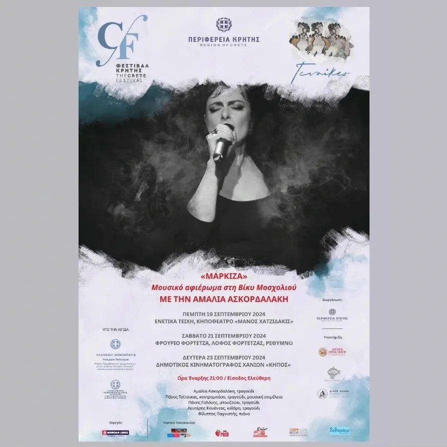 Στο πλαίσιο της παράλληλης δράσης του «Φεστιβάλ Κρήτης» 2024 «ΓΥΝΑΙΚΕΣ», πρόκειται να πραγματοποιηθεί η συναυλία «ΜΑΡΚΙΖΑ», με την ερμηνεύτρια Αμαλία Ασκορδαλάκη, μια μουσική περιπλάνηση στα μονοπάτια της Βίκυς Μοσχολιού, στις 19 Σεπτεμβρίου 2024 στο Κηποθέατρο «Μάνος Χατζιδάκις», στις 21 Σεπτεμβρίου 2024, στο φρούριο Φορτέτσα Ρεθύμνου, στο «Λόφο» και στις 23 Σεπτεμβρίου 2024, στο Δημοτικό Κινηματογράφο Χανίων, στον «Κήπο», με ώρα έναρξης 9:00μ.μ. και με ελεύθερη είσοδο για το κοινό.