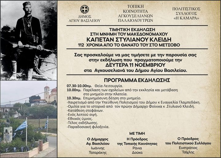 Σας προσκαλούμε να μας τιμήσετε με την παρουσία σας στην εκδήλωση που πραγματοποιούμε την ΔΕΥΤΕΡΑ 11 ΝΟΕΜΒΡΙΟΥ στα Αγκουσελιανά του Δήμου Αγίου Βασιλείου.