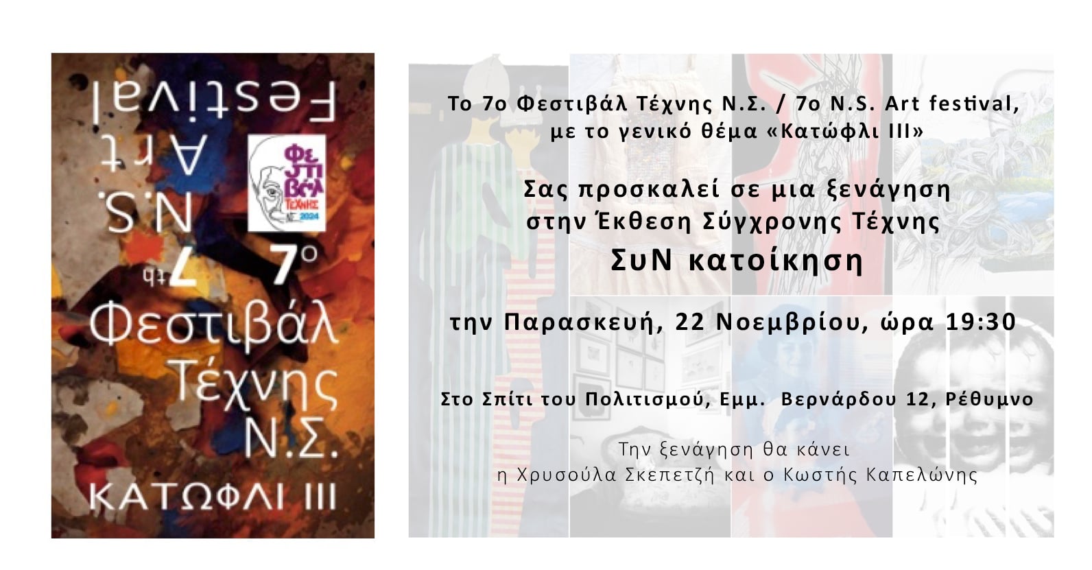 Στο μεταξύ τη προσεχή Παρασκευή 22 Νοεμβρίου και ώρα 19:30 θα γίνει ξενάγηση στην έκθεση "Συγκατοίκηση" που φιλοξενείται στο Σπίτι του Πολιτισμού. Την ξενάγηση θα κάνουν η Χρυσή Σκεπετζή και ο Κωστής Καπελώνης.