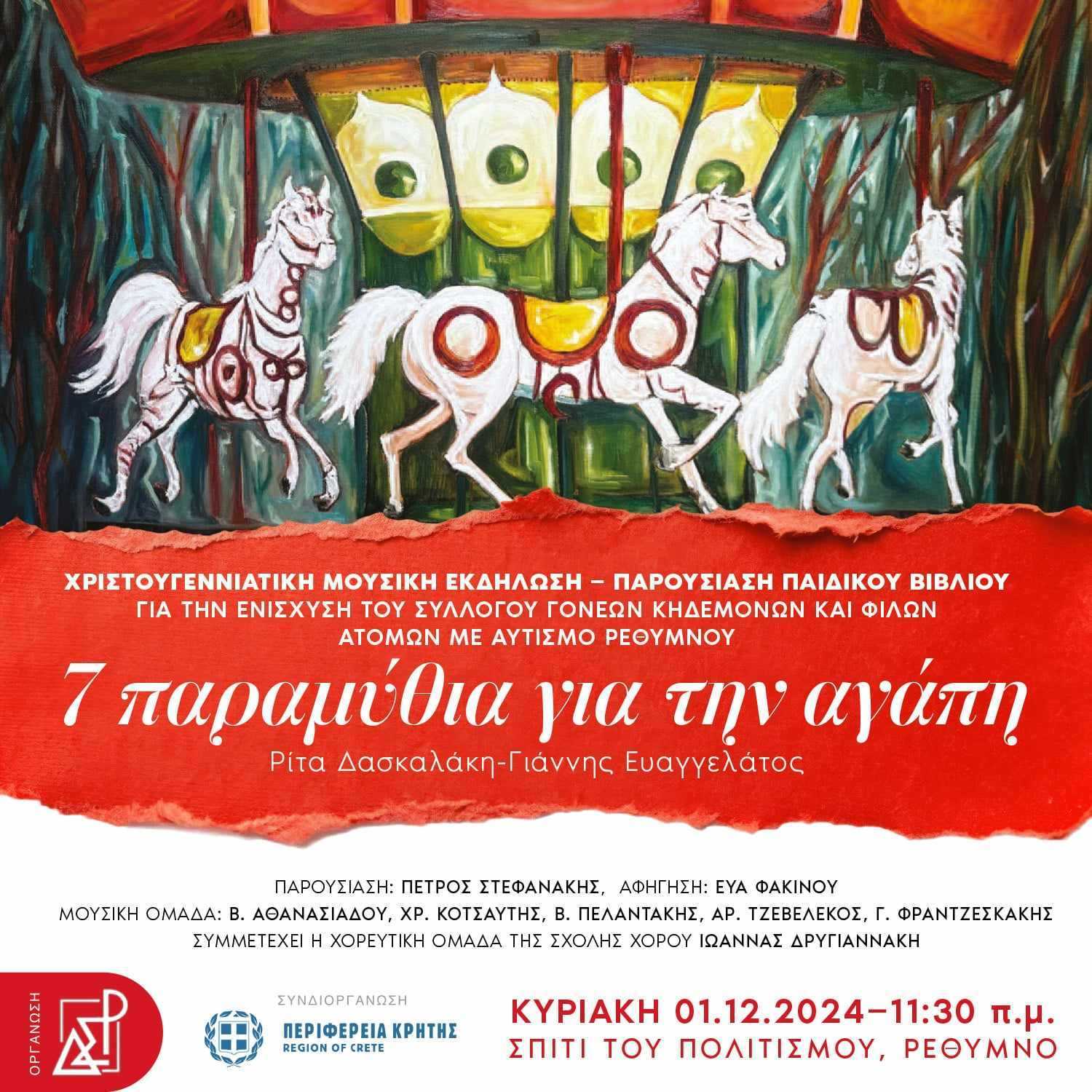 Την Κυριακή 1 Δεκεμβρίου 2024 στις 11.30 πμ στο Σπίτι Πολιτισμού Ρεθύμνου θα καλωσορίσουμε το πνεύμα των Χριστουγέννων στο Ρέθυμνο, μέσα από την Χριστουγεννιάτικη μουσική εκδήλωση με αφήγηση ενός παραμυθιού για όλους.