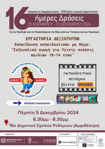 Η Περιφέρεια Κρήτης, Αυτοτελές Γραφείο Ισότητας, Περιφερειακή Επιτροπή Ισότητας των Φύλων Κρήτης, σε συνεργασία με την Α.ΞΕ.Π.Τ. «Ασφαλή Ξένοιαστα Παιδιά Τώρα», υλοποιούν από το 2022 εκπαιδευτικά-βιωματικά εργαστήρια σεξουαλικής αγωγής για γονείς, εκπαιδευτικούς, παιδιά και εφήβους, στο πλαίσιο των «16ήμερων Δράσεων για την Πρόληψη και την Καταπολέμηση της Βίας κατά των Γυναικών και των Κοριτσιών», σε συνεργασία με σχολικές μονάδες, συλλόγους γονέων και κηδεμόνων, συλλόγους διδασκόντων, πολιτιστικούς συλλόγους, αλλά και Δημοτικές Επιτροπές Ισότητας σε όλη την Κρήτη. Φέτος για πρώτη φορά, με τη συνεργασία και την υποστήριξη της Διεύθυνσης Δευτεροβάθμιας Εκπαίδευσης Λασιθίου θα πραγματοποιηθεί αντίστοιχη δράση στην Ιεράπετρα.
