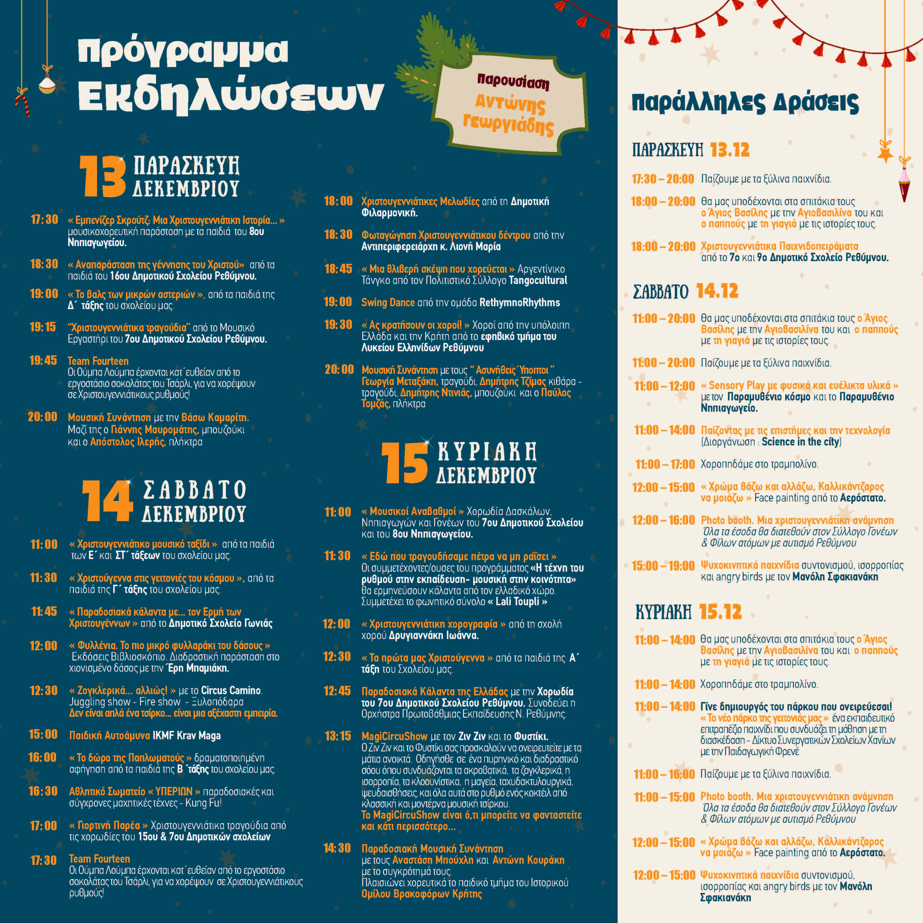 12:45 Παραδοσιακά Κάλαντα της Ελλάδας με την Χορωδία του 7ου Δημοτικού Σχολείου Ρεθύμνου. Συνοδεύει η Ορχήστρα Πρωτοβάθμιας Εκπαίδευσης Ν. Ρεθύμνης.