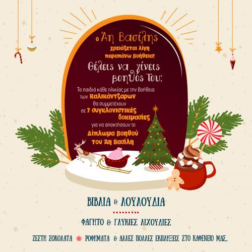 11:00 - 14:00 Θα μας υποδέχονται στα σπιτάκια τους ο Άγιος Βασίλης με την Αγιοβασιλίνα του και ο παππούς με τη γιαγιά με τις ιστορίες τους.