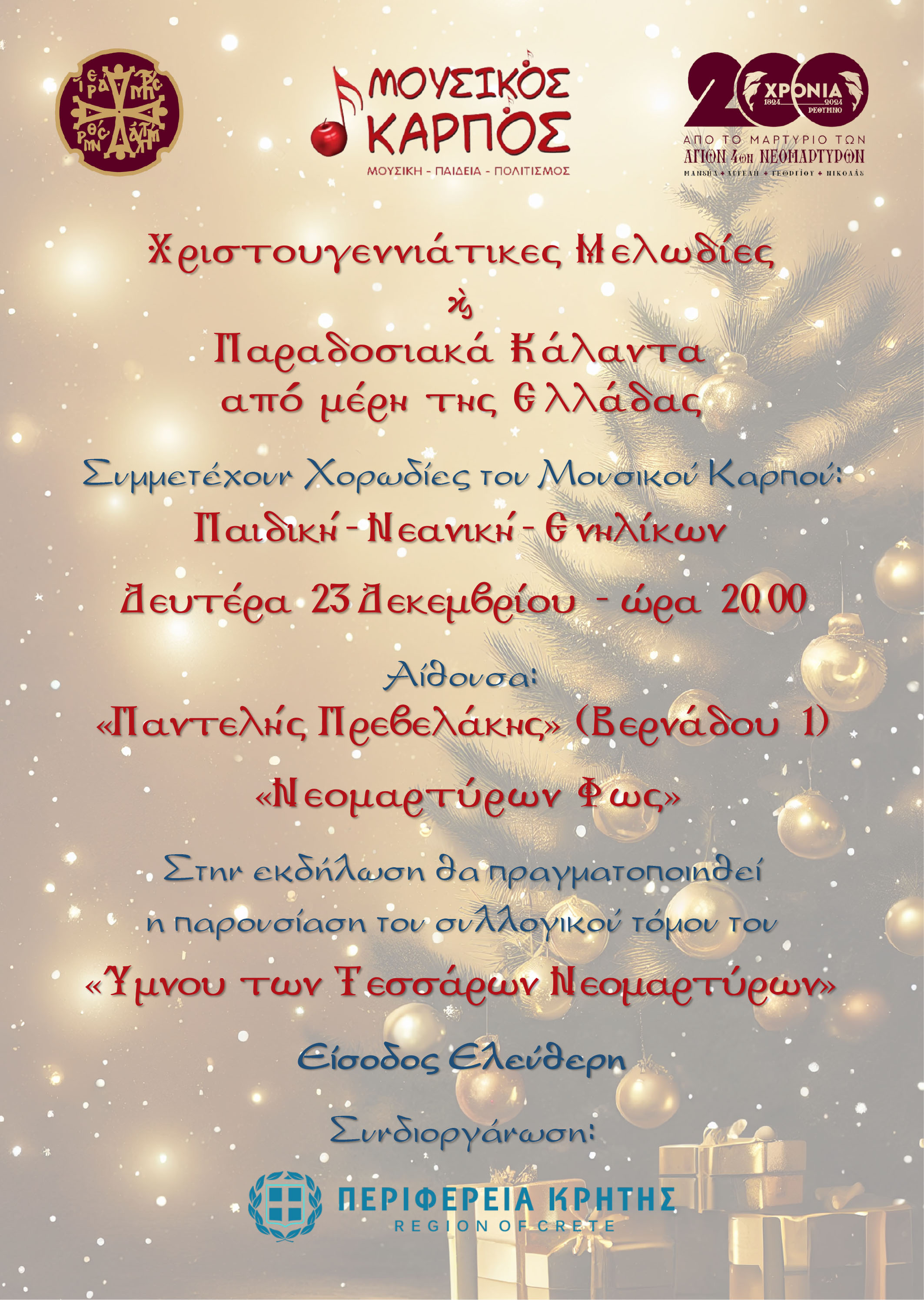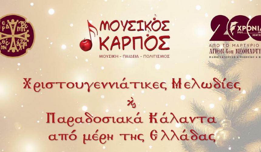Σας προσκαλούμε να γιορτάσουμε μαζί τη μυσταγωγία των Χριστουγέννων με μια ξεχωριστή συναυλία. Οι τρεις χορωδίες του Μουσικού Καρπού – η Παιδική, η Νεανική και η Χορωδία Ενηλίκων – θα παρουσιάσουν ένα πλούσιο πρόγραμμα γεμάτο χριστουγεννιάτικες μελωδίες, αγαπημένα τραγούδια και παραδοσιακά κάλαντα από όλο τον κόσμο.