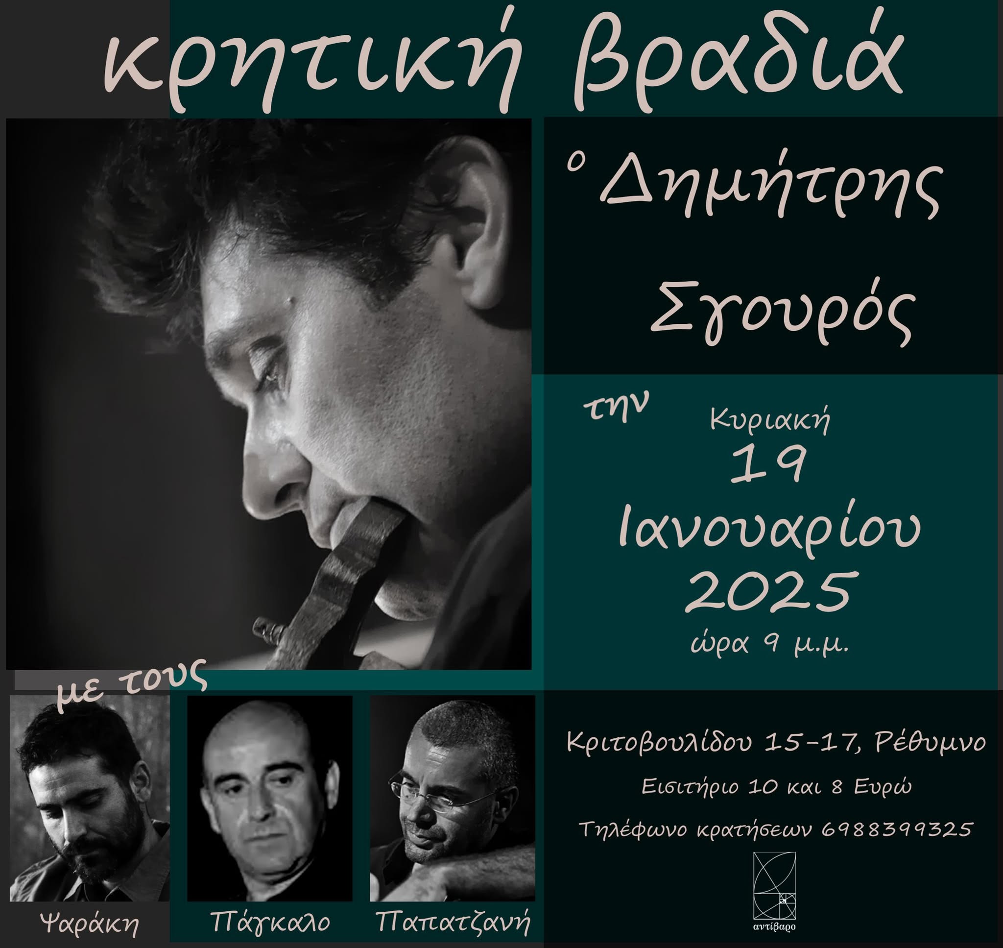 Ο Δημήτρης Σγουρός θα παρουσιάσει στο θέατρο «Αντίβαρο» ένα πρόγραμμα με αυθεντική μουσική και τραγούδια της Κρήτης. Τραγούδια από τη δισκογραφία του, αλλά και επιλεγμένα παραδοσιακά τραγούδια της Κρήτης, που αναδεικνύουν τον πλούτο, τη δύναμη και την ομορφιά της κρητικής ψυχής, δοσμένα με το ιδιαίτερο προσωπικό του ύφος, τη δεξιοτεχνία και το μεράκι του.