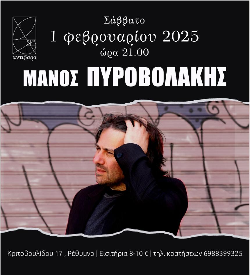 Μια ακόμη επιτυχημένη εκδήλωση στο πλαίσιο του κύκλου "Μουσική κάθε Κυριακή" ολοκληρώθηκε χθες με τη συναυλία Αρχαίας Ελληνικής και παραδοσιακής μουσικής που δόθηκε στο Αντίβαρο στο Ρέθυμνο (Θανάσης Κλεόπας). Οι θεατές εξέφρασαν την έκπληξή τους για την ομορφιά του ξεχωριστού αυτού ήχου και ζήτησαν να επαναληφθεί η συναυλία σε πρώτη ευκαιρία, αίτημα στο οποίο οι διοργανωτές κι ο μουσικός συμφώνησαν, Σε αρκετά διαφορετικό κλίμα και ημέρα Σάββατο κατ' εξαίρεση συνεχίζονται οι εκδηλώσεις στο Αντίβαρο. Την πρώτη μέρα του Φεβρουαρίου έρχεται στην ατμοσφαιρική θεατρική και μουσική σκηνή της πόλης ο Μάνος Πυροβολάκης, ένας μουσικός που δεν χρειάζεται ιδιαίτερες συστάσεις. Ως ιδιαίτερος τραγουδοποιός, ο Μάνος ξεχώρισε σαν σύγχρονος λυράρης που συνδύασε μέσα από τις μουσικοσυνθέσεις του την pop – rock μουσική με τις παραδοσιακές μελωδίες. Σ' ένα πρόγραμμα πολύπτυχο γεμάτο εναλλαγές στήνει και φέτος το δικό του κρητικό – rock πάλκο. Παράλληλα με τις επιτυχίες του : '‘Το Χαμόγελο σου'’, '‘Τι μας ενώνει’, ΄'‘Όλα για όλα'’,''Στης εκκλησιάς την
