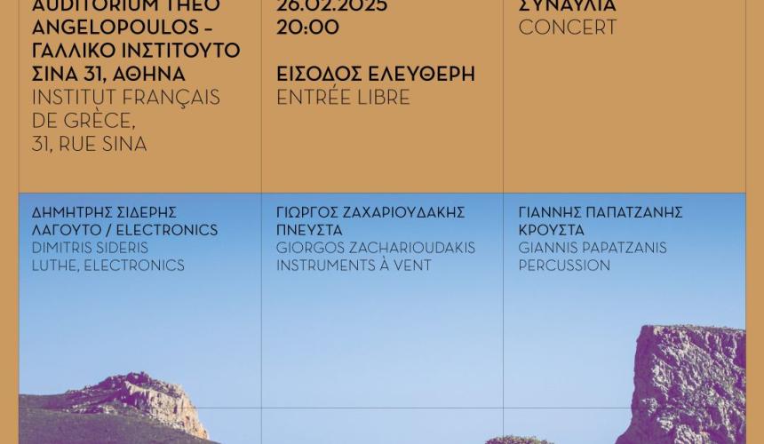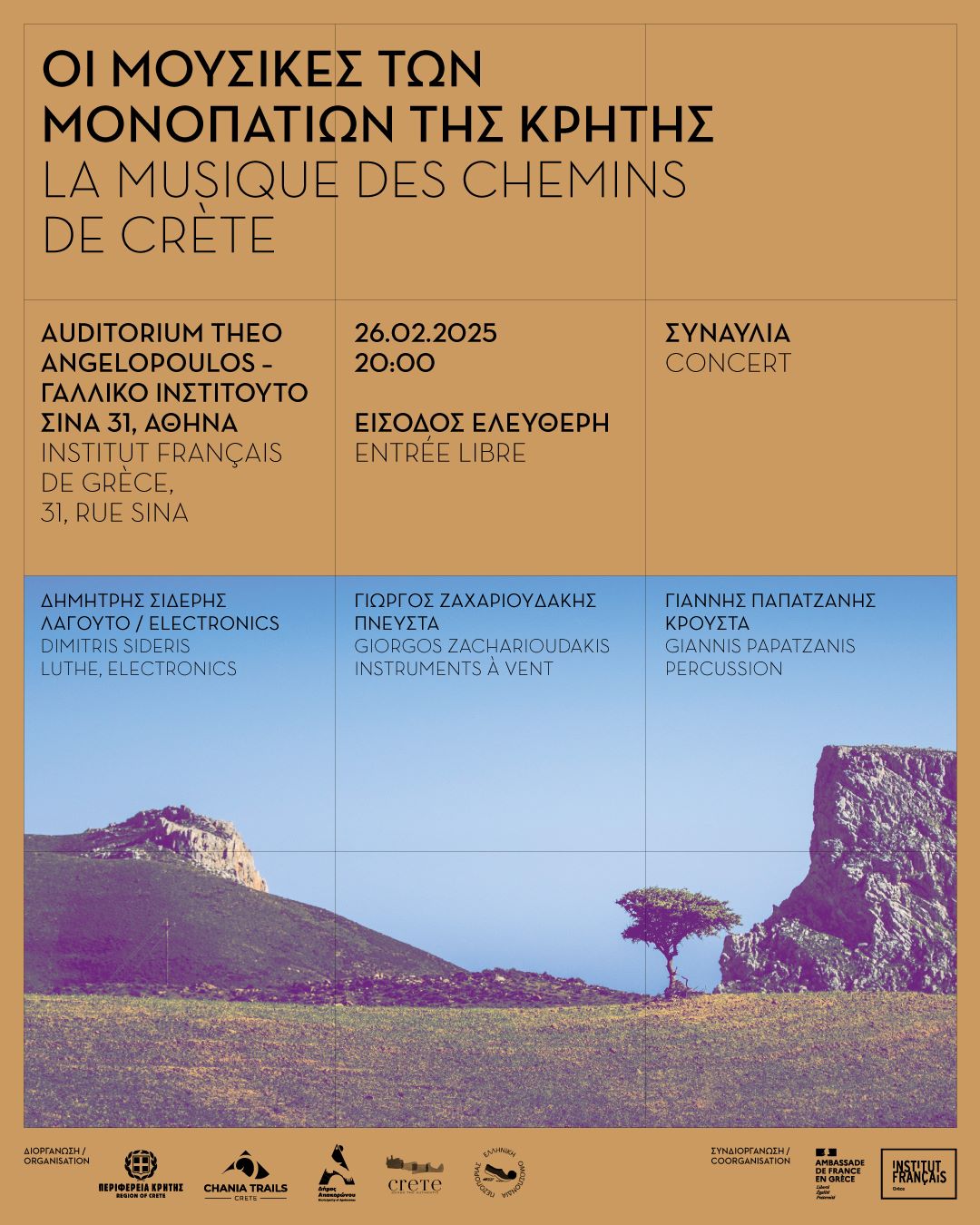 Η Περιφέρεια Κρήτης και το Γαλλικό Ινστιτούτο Ελλάδας διοργανώνουν, με ελεύθερη είσοδο, τη συναυλία «Οι Μουσικές των Μονοπατιών της Κρήτης» στο auditorium Theo Angelopoulos του Γαλλικού Ινστιτούτου στην Αθήνα την Τετάρτη 26 Φεβρουαρίου στις 20.00 με τους Δημήτρη Σιδερή (λαγούτο/electronics), Γιώργο Ζαχαριουδάκη (πνευστά), Γιάννη Παπατζανή (κρουστά).