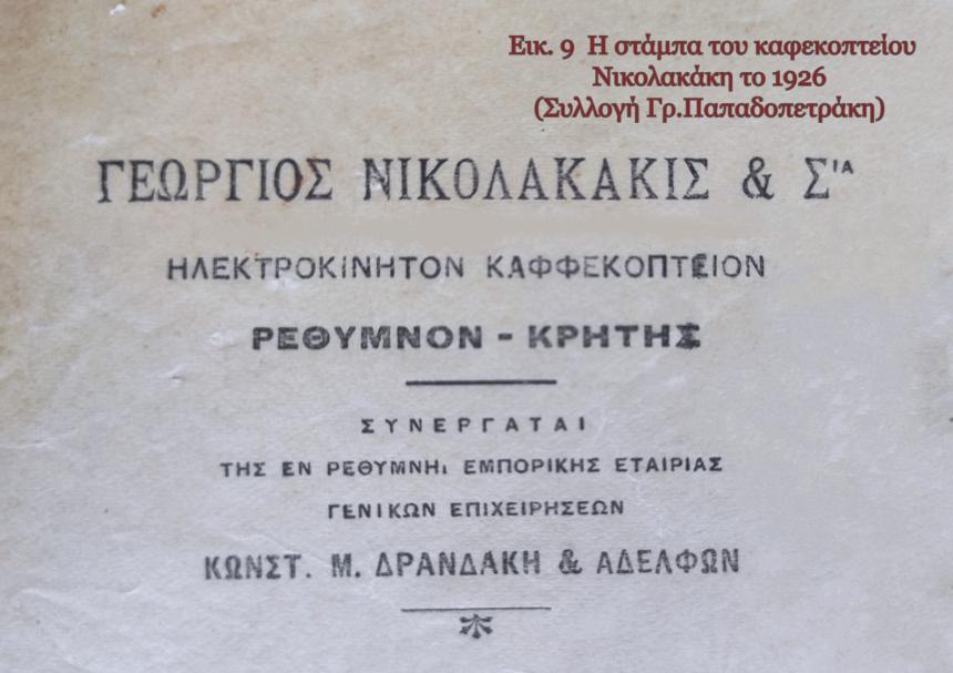 Παπαδάκης, βέβαια καταγράφεται και ο τρίτος Αρμένιος που μνημονεύεται σήμερα. Πρόκειται για τον Χαράλαμπο Παπαδάκη, το πραγματικό όνομα του οποίου φαίνεται να ήταν Χαϊραπέτ Καλαϊτζιάν. (Εικ. 8) Ο Καλαϊτζιάν δεν ήταν κατά κύριο επάγγελμα καφεκόπτης, όπως οι προαναφερθέντες, αλλά παντοπώλης. Το παντοπωλείο του όμως, διέθετε μηχανή άλεσης καφέ, οπότε ο ίδιος εργαζόταν και ως καφεκόπτης. Το εν λόγω παντοπωλείο βρισκόταν στην οδό Ωραίας 12, σημερινή πλατεία Πετυχάκη, σε πολύ κοντινή απόσταση από το πρώτο συνεργατικό καφεκοπτείο του Πετσέλη και του Παύλου. Επίσης, απέναντι από το συγκεκριμένο παντοπωλείο βρισκόταν από το 1924 η επιχείρηση του Γεώργιου Μ. Νικολακάκη, γνωστού αργότερα και ως «Μόκα», πιθανότατα του πρώτου καφεκόπτη που χρησιμοποίησε ηλεκτροκίνητο σύστημα άλεσης καφέ στο Ρέθυμνο. (Εικ.9)