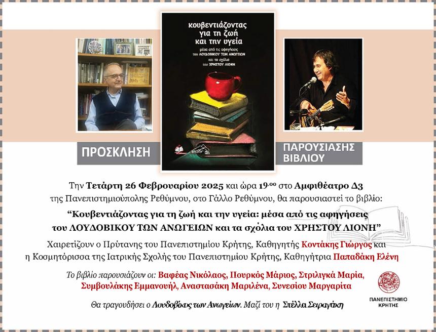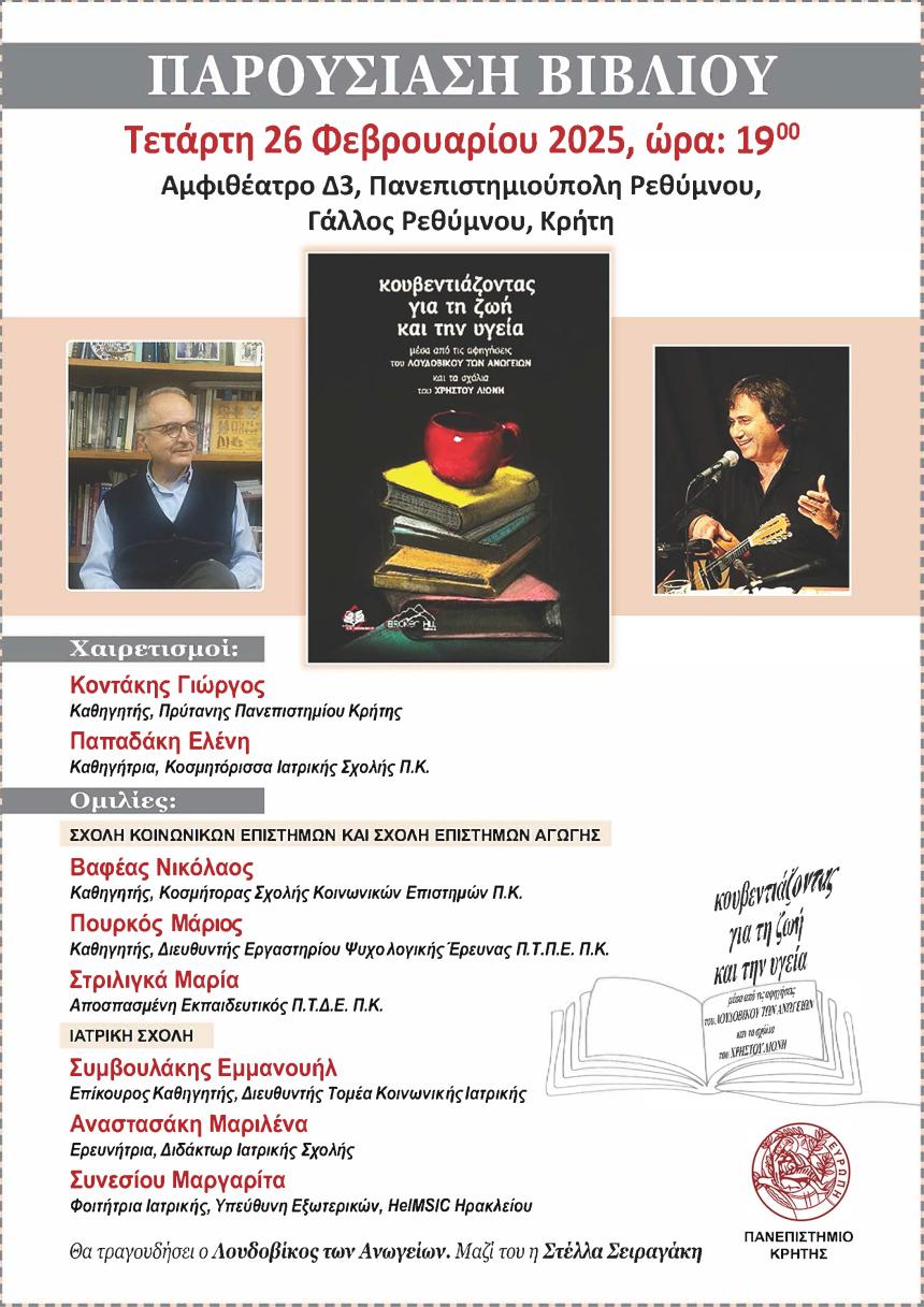 ΠΑΡΟΥΣΙΑΣΗ ΒΙΒΛΙΟΥ: “Κουβεντιάζοντας για τη ζωή και την υγεία: μέσα από τις αφηγήσεις του ΛΟΥΔΟΥΒΙΚΟΥ ΤΩΝ ΑΝΩΓΕΙΩΝ και τα σχόλια του ΧΡΗΣΤΟΥ ΛΙΟΝΗ” 26-2-2025