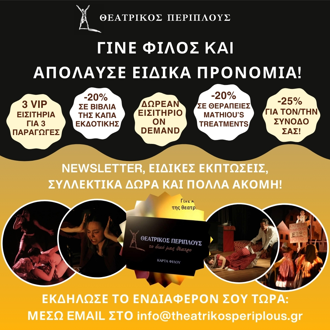 Βρείτε όλες τις πληροφορίες για την Κάρτα Φίλου, τα ειδικά προνόμια και τις εκπτώσεις στο: https://www.theatrikosperiplous.gr/?page_id=1684
