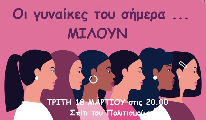 20.00 : "Οι γυναίκες του σήμερα ...ΜΙΛΟΥΝ" ομιλίες με εκπροσώπους φορέων για την γυναίκα του σήμερα.