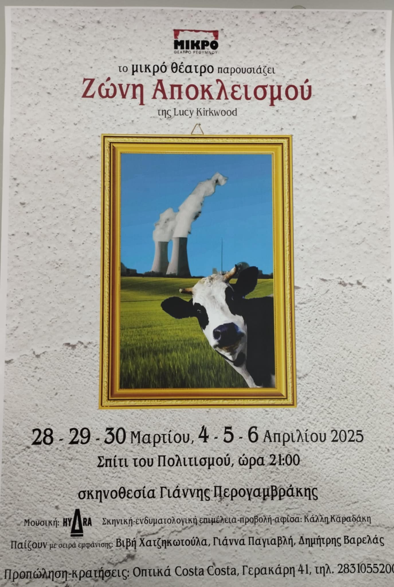 Το Μικρό Θέατρο Ρεθύμνου συνεχίζει την πορεία του στον θεατρικό χώρο του Ρεθύμνου με την «Ζώνη Αποκλεισμού», ένα έργο βασισμένο στο “The Children” της βραβευμένης Βρετανίδας συγγραφέα Lucy Kirkwood, σε σκηνοθεσία Γιάννη Περογαμβράκη.