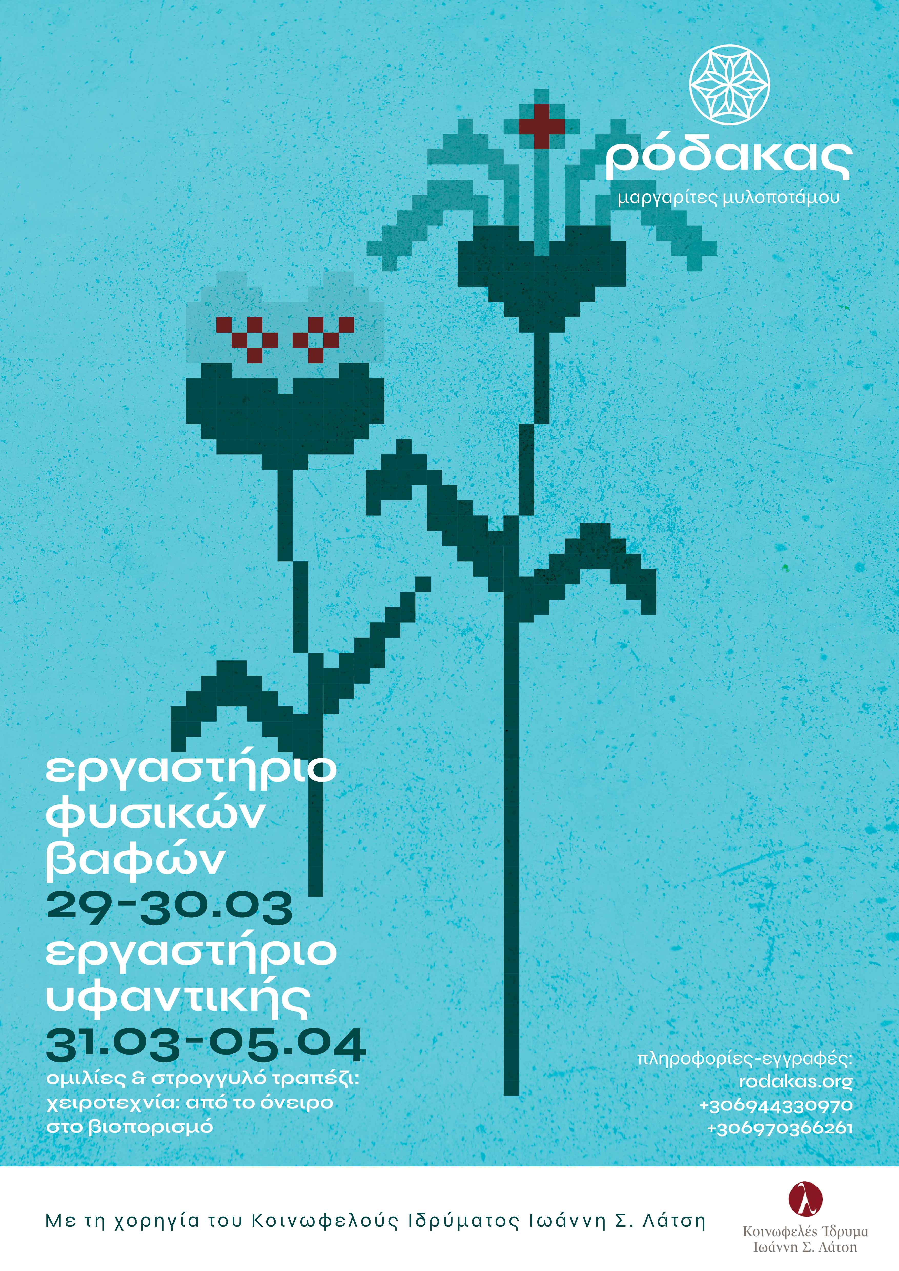 Αυτή τη φορά με την ευγενική υποστήριξη και χορηγία του Κοινωφελούς Ιδρύματος Ιωάννη Σ. Λάτση. Η Clarissa Joy Holmes θα μας μυήσει στις φυσικές βαφές και στην τεχνικη eco printing, ο Δάσκαλος Μανώλης Κουράτορας -μετά από ομόθυμο αίτημα όσων παρακολούθησαν το προηγούμενο εργαστήριο- θα συνεχίσει τα μαθήματα σχεδίου και νηματολογίας και η κορυφαία υφάντρα και δασκάλα μας κ. Δέσποινα Σωμάκη θα “κατεβάσει” και θα διδάξει τα σχέδια στους Μαργαριτσανούς αργαλειούς. Οι θέσεις έχουν ήδη συμπληρωθεί, αλλά για όσες/ους πάνε στις Μαργαρίτες τις μέρες αυτές, η επίσκεψή τους στους αργαλειούς θα είναι μοναδική εμπειρία.