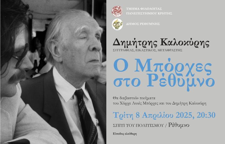 Το Τμήμα Φιλολογίας του Πανεπιστημίου Κρήτης και ο Δήμος Ρεθύμνης σάς προσκαλούν στην ομιλία του Δημήτρη Καλοκύρη, συγγραφέα, εικαστικού, μεταφραστή, με θέμα «Ο Μπόρχες στο Ρέθυμνο», που θα πραγματοποιηθεί την Τρίτη 8 Απριλίου και ώρα 20:30 στο Σπίτι του Πολιτισμού στο Ρέθυμνο.