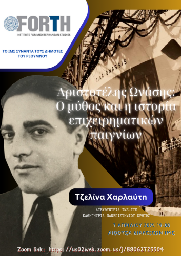 Με μια εξαιρετικά ενδιαφέρουσα εισήγηση με θέμα : « Αριστοτέλης Ωνάσης: Ο μύθος και η ιστορία επιχειρηματικών παιγνίων» συνεχίζεται, τη Δευτέρα 7 Απριλίου 2025, στις 7 μ.μ., ο κύκλος των ανοιχτών επιστημονικών ομιλιών που συνδιοργανώνουν ο Δήμος Ρεθύμνου και το Ινστιτούτο Μεσογειακών Σπουδών του Ιδρύματος Τεχνολογίας και Έρευνας (ΙΤΕ).