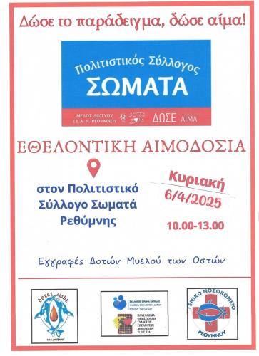 Ο Πολιτιστικός Σύλλογος Σωματά, περήφανο μέλος του δικτύου του Συλλόγου Εθελοντών Αιμοδοτών Νομού Ρεθύμνου ΔΟΤΕΣ ΖΩΗΣ, σας προσκαλεί σε εθελοντική αιμοδοσία που θα πραγματοποιηθεί την Κυριακή 6 Απριλίου 2025 τις ώρες 10.00 – 13.00 στον χώρο του Πολιτιστικού Συλλόγου, στο χωριό Σωματά.