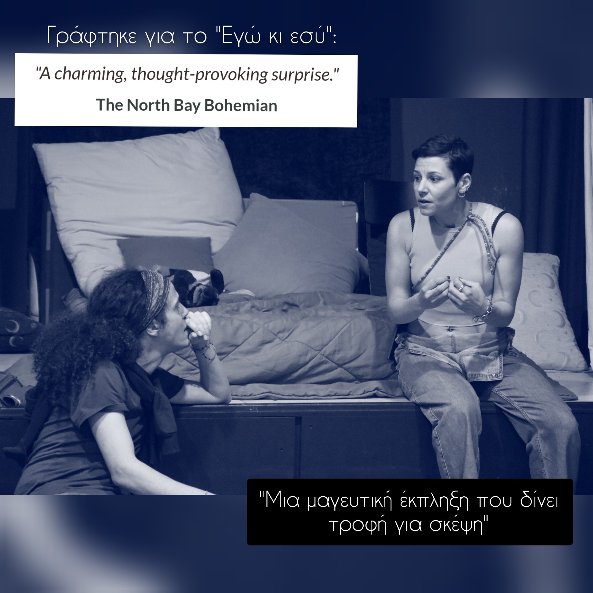 Το «Εγώ κι Εσύ» πρωτοπαρουσιάστηκε στην Ελλάδα πριν από δύο χρόνια και τώρα επιστρέφει για 2η φορά στη χώρα μας από τον Θεατρικό Περίπλου, υπό τη σκηνοθετική μαεστρία της Μαρίας Καντιφέ και τις ερμηνείες των Μαρία Σκορδίλη και Μάριου Μαραγκουδάκη.