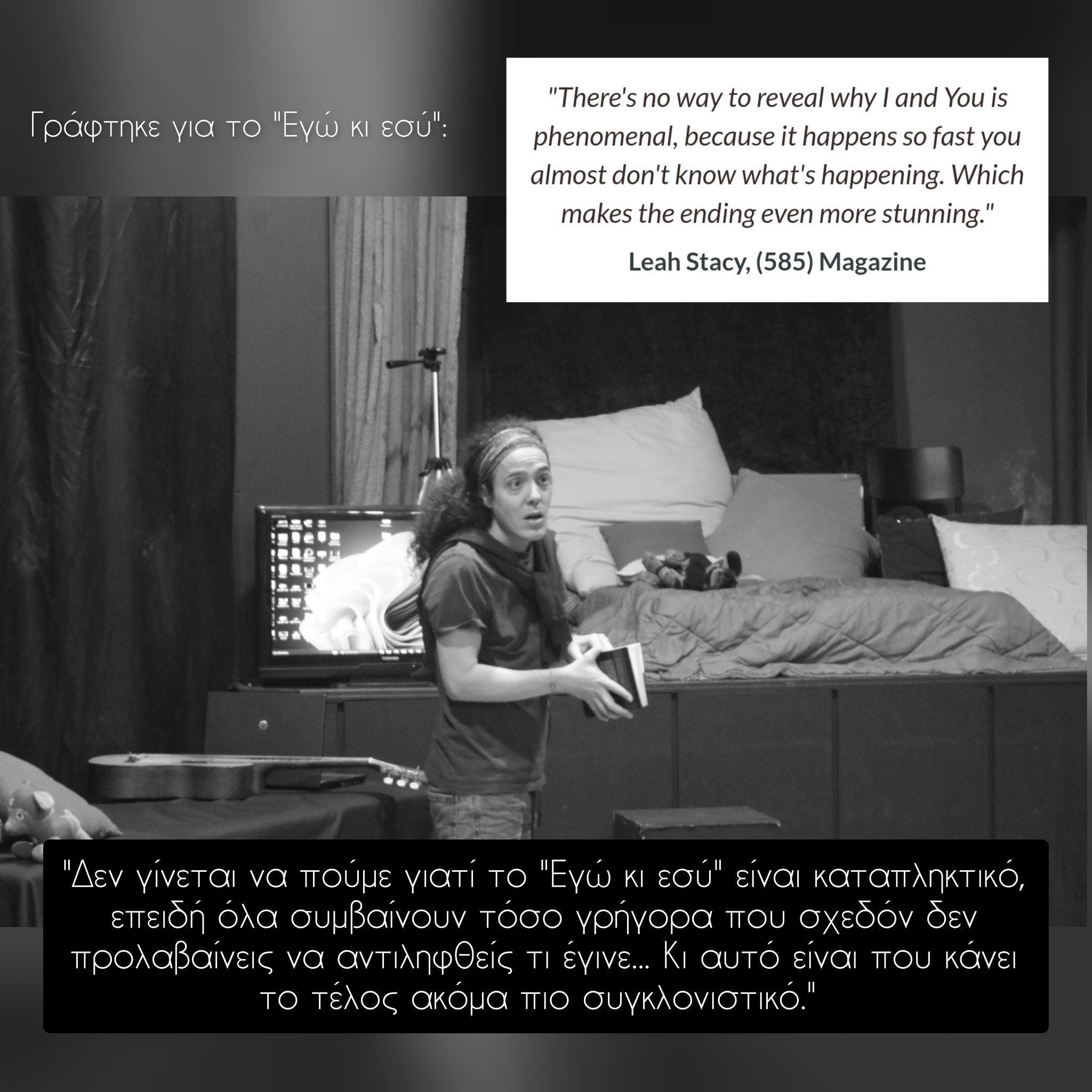 Το, βραβευμένο από την Ένωση Αμερικανών Θεατρικών Κριτικών (ATCA), «Εγώ κι Εσύ» της Lauren Gunderson έρχεται για 2η φορά στην Ελλάδα από τον Θεατρικό Περίπλου στα τέλη Μαΐου, σε σκηνοθεσία της Μαρίας Καντιφέ και μετάφραση Χρήστου Νικολόπουλου.