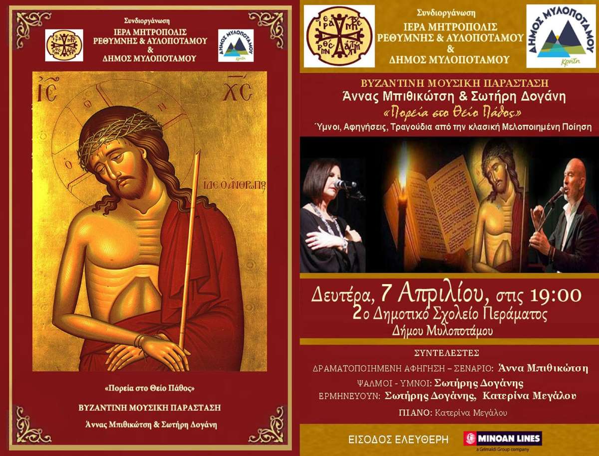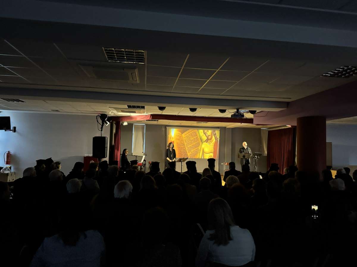 Το απόγευμα της Δευτέρας, 7ης Απριλίου 2025, στην αίθουσα εκδηλώσεων του 2ου Δημοτικού Σχολείου Περάματος Μυλοποτάμου, πραγματοποιήθηκε με επιτυχία η βυζαντινή μουσική παράσταση με τίτλο «Πορεία στο Θείο Πάθος», με ύμνους, αφηγήσεις και τραγούδια από την κλασική μελοποιημένη ποίηση, αφιερωμένα στην Αγία και Μεγάλη Εβδομάδα.