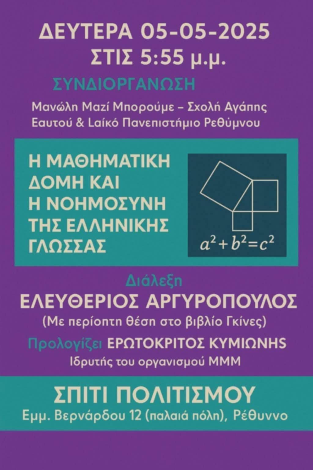 Το MANΩΛH MAZI MΠOPOYME - ΣXOΛH AΓAΠHΣ EAYTOY PEΘYMNOY και το ΛAΪKO ΠANEΠIΣTHMIO PEΘYMNOY σας προσκαλούν την Δευτέρα 5/5/2025 & ώρα 5.55 μμ στο ΣΠITI TOY ΠOΛITIΣMOY να παραστείτε στην διάλεξη με θέμα "H MAΘHMATIKH ΔOMH KAI H NOHMOΣYNH THΣ EΛΛHNIKHΣ ΓΛΩΣΣAΣ".