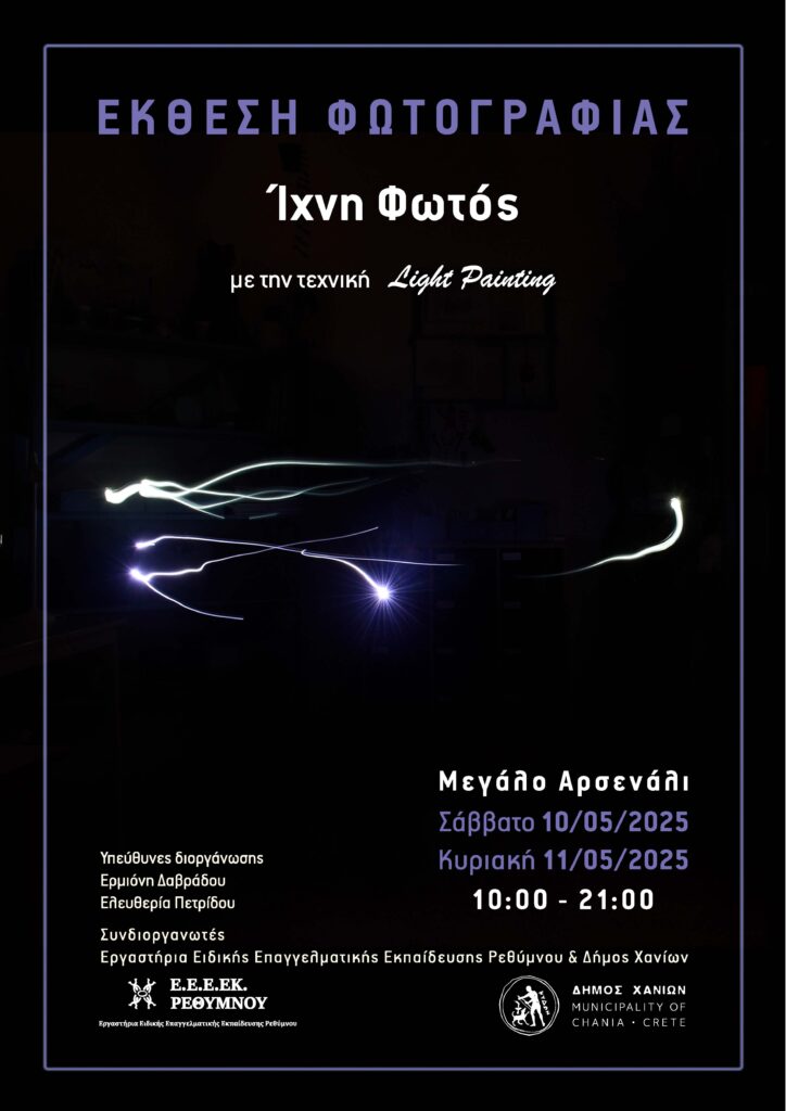 Η ειδικότητα ´Τέχνη Φωτογραφίας´ της Σ.Α.Ε.Κ. Ρεθύμνου συμμετέχει στην καλλιτεχνική έκθεση φωτογραφίας με τίτλο «Ίχνη Φωτός», η οποία θα φιλοξενηθεί στον εκθεσιακό χώρο “Μεγάλο Αρσενάλι - Κέντρο Αρχιτεκτονικής της Μεσογείου ” στην πόλη των Χανiων, στις 10 και 11 Μαΐου 2025, με ώρες λειτουργίας 10:00 – 21:00.