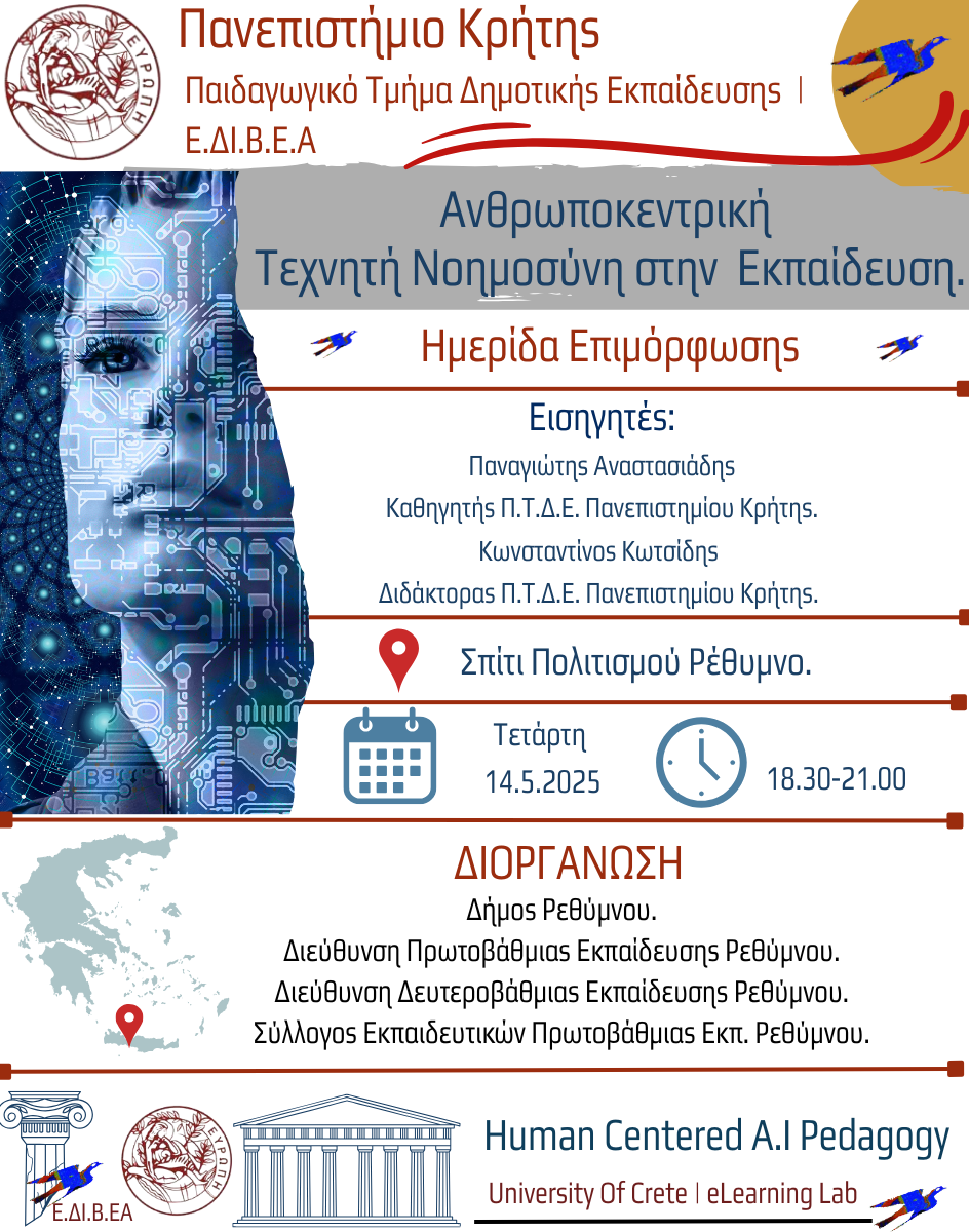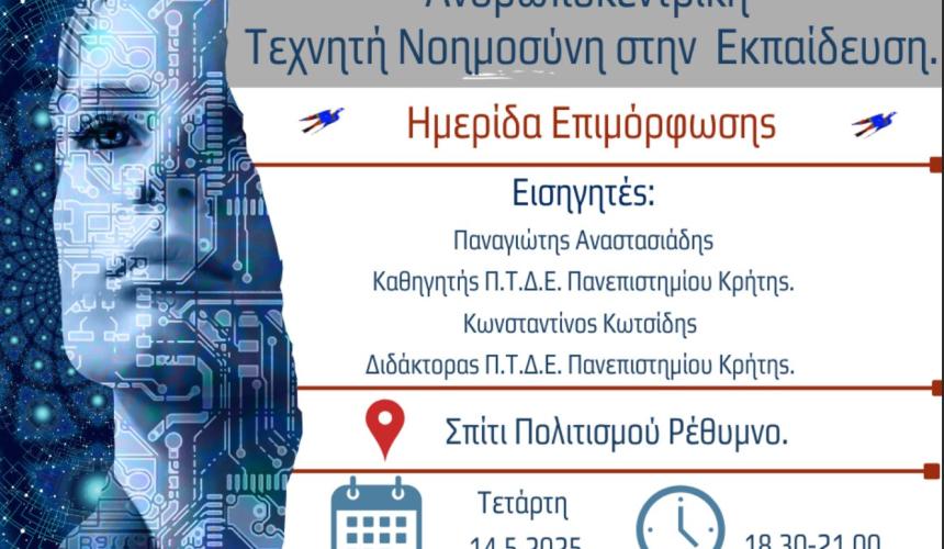 Η δια ζώσης επιμόρφωση θα πραγματοποιηθεί την Τετάρτη 14 Μαΐου 2025 και ώρα 18.30 - 21.00 στο Σπίτι Πολιτισμού Ρεθύμνου.