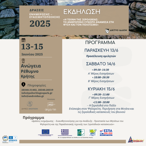 Συνέδριο με θέμα «Η Τέχνη της Ξερολιθιάς: Το ανθρώπινο σύνορο ανάμεσα στη φύση και τον πολιτισμό», θα πραγματοποιηθεί στα Ανώγεια, από τις 13 έως τις 15 Ιουνίου 2025.