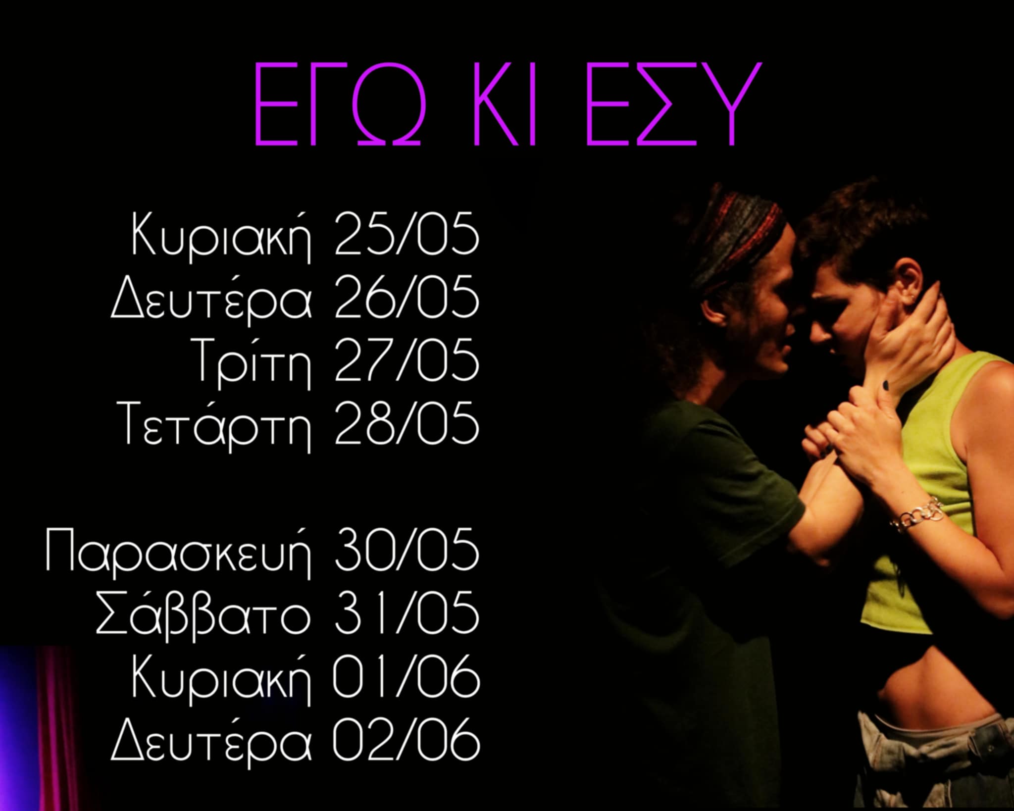Το «Εγώ κι Εσύ», σε μετάφραση Χρήστου Νικολόπουλου, έχει δημιουργήσει ήδη από την περίοδο των προβών μεγάλη ανυπομονησία στο κοινό, γεγονός που οδήγησε τον θίασο να προσθέσει δύο ακόμα παραστάσεις για την Τετάρτη 28 Μαΐου και την Δευτέρα 2 Ιουνίου. Οι παραστάσεις θα πραγματοποιηθούν στην αίθουσα της Περιηγητικής Λέσχης Ρεθύμνου, η οποία έχει αναδιαμορφωθεί, ώστε να προσφέρει μια άνετη και φιλόξενη εμπειρία για τους θεατές. Για κρατήσεις, μπορείτε να καλείτε στο: 6945 458 516.
