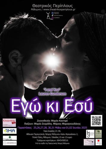 Το πολυβραβευμένο θεατρικό έργο «Εγώ κι Εσύ» (I and You) της κορυφαίας Αμερικανίδας συγγραφέα Lauren Gunderson ανεβαίνει για 2η φορά στην Ελλάδα από τον Θεατρικό Περίπλου. Παράλληλα με μια εξαιρετικά επιτυχημένη πορεία σε θέατρα του εξωτερικού, το έργο έρχεται για 1η φορά στην Κρήτη!