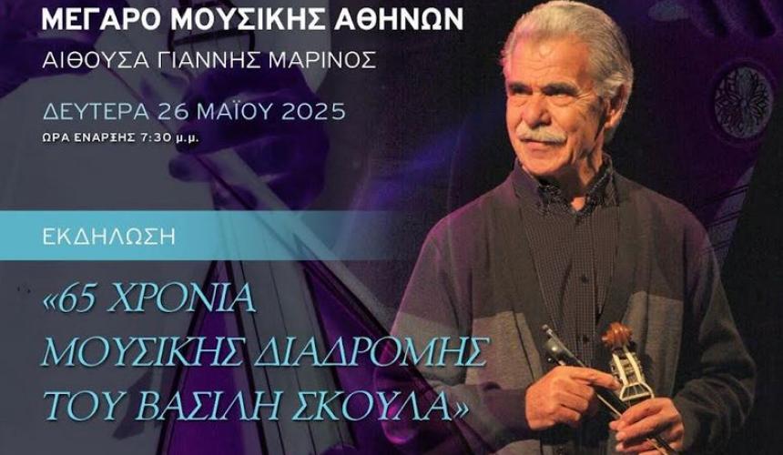 Εκδήλωση - αφιέρωμα στον κορυφαίο ερμηνευτή και λυράρη, Βασίλη Σκουλά, πραγματοποιείται τη Δευτέρα 26 Μαΐου, στις 7:30 μ.μ. στην αίθουσα Γιάννης Μαρίνος του Μεγάρου Μουσικής Αθηνών, με τίτλο «65 χρόνια μουσικής διαδρομής του Βασίλη Σκουλά - Η Κρήτη του χθες και του σήμερα», με την στήριξη της Περιφέρειας Κρήτης και ελεύθερη είσοδο.