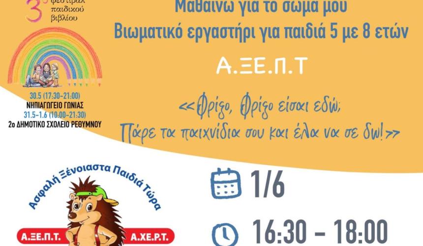Βιωματικό εργαστήριο σεξουαλικής αγωγής από την Α.Ξ.Ε.Π.Τ. (Ασφαλή Ξένοιαστα Παιδιά Τώρα), τη βραβευμένη ομάδα του Φρίξου, με θέμα: «Παίζω με τον Φρίξο και μαθαίνω για το σώμα μου και τις διαπροσωπικές σχέσεις», για παιδιά ηλικίας 5-8 ετών.