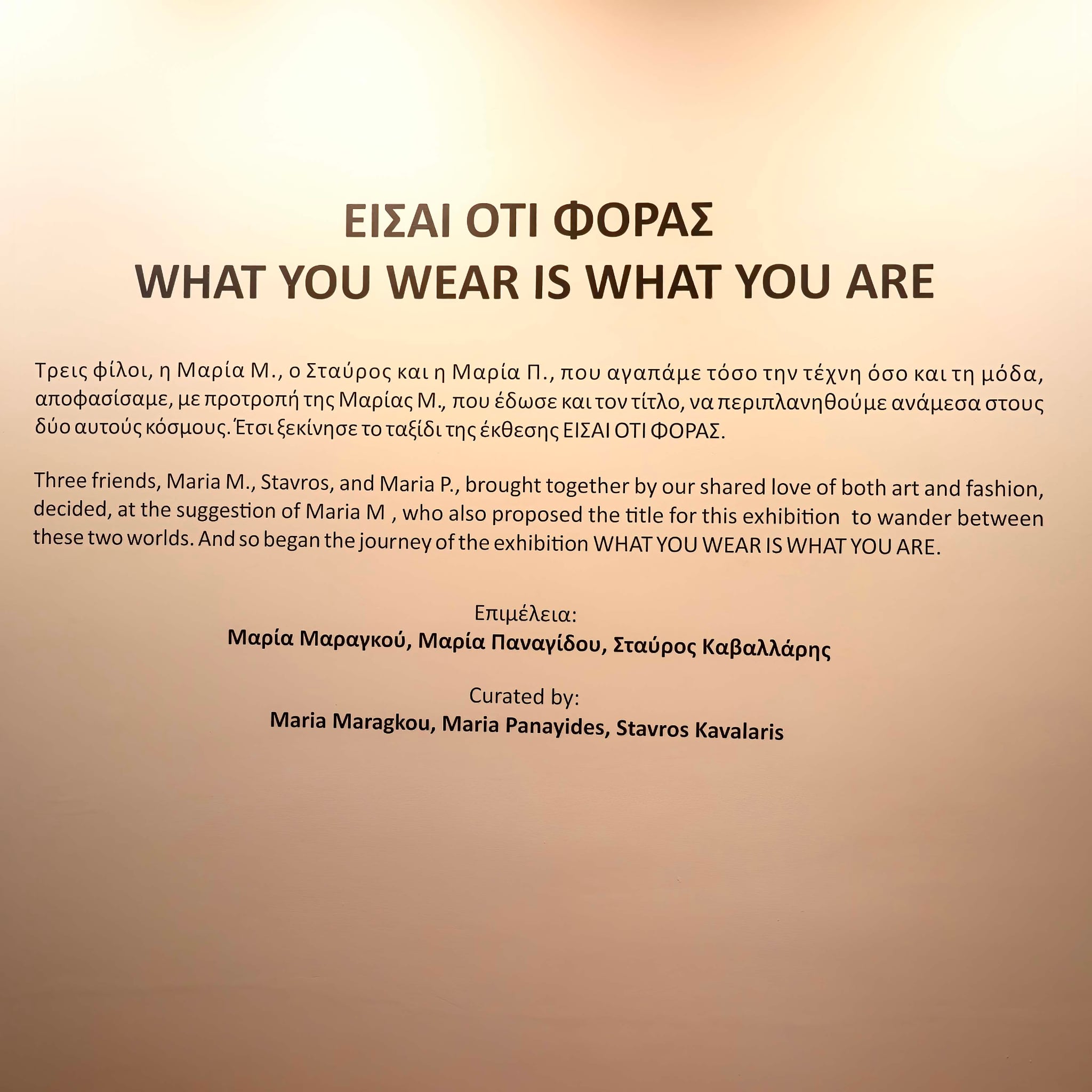 Με την έκθεση ΕΙΣΑΙ ΟΤΙ ΦΟΡΑΣ οι επιμελητές, Μαρία Μαραγκού, Μαρία Παναγίδου και Σταύρος Καβαλλάρης, επιχειρούν να αναδείξουν την αμφίδρομη σχέση της μόδας και των προκλήσεων της εποχής μας όπως αυτές εκφράζονται, και επηρεάζονται από τη σύγχρονη τέχνη και τους προβληματισμούς που νεωτεριστικά αυτή προβάλλει.