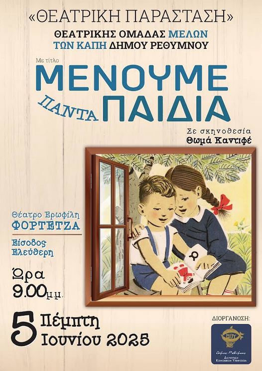 Τα πέντε ΚΑΠΗ του Δήμου Ρεθύμνης ενώνουν τις καλλιτεχνικές τους δυνάμεις και, υπό τη σκηνοθετική καθοδήγηση του Θωμά Καντιφέ (Θεατρικός Περίπλους), παρουσιάζουν τη θεατρική παράσταση «Μένουμε πάντα παιδιά», την Πέμπτη 5 Ιουνίου 2025 και ώρα 21:00, στο εμβληματικό θέατρο Ερωφίλη, στη Φορτέτζα.