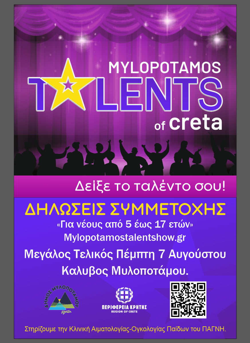 Ο απόλυτος θεσμός ταλέντου της Κρήτης επιστρέφει φέτος για 6η συνεχή χρονιά, πιο δυνατός και λαμπερός από ποτέ! Το "Mylopotamos Talents of Creta 2025", που διοργανώνεται από τον Πολιτιστικό Σύλλογο Καλυβού Μυλοποτάμου, με τη συνδιοργάνωση της Περιφέρειας Κρήτης και του Δήμου Μυλοποτάμου, καλεί όλα τα παιδιά της Κρήτης να δείξουν το ταλέντο τους!