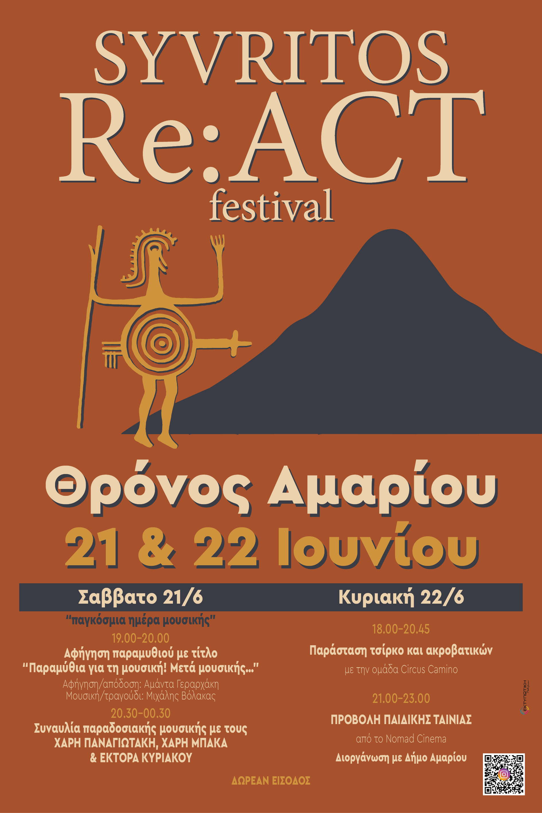 Ο Πολιτιστικός Σύλλογος Θρόνους - Κλεισιδίου με χαρά ανακοινώνει τη διοργάνωση του πρώτου φεστιβάλ Syrvritos Re:ACT festival, που θα πραγματοποιηθεί στις 21 και 22 Ιουνίου στο Θρόνος Αμαρίου. Ένα διήμερο πολιτιστικό γεγονός που συνδυάζει παραδοσιακή μουσική, αφήγηση, σύγχρονη τέχνη του δρόμου, παιδικό πρόγραμμα και προβολή κινηματογράφου — για μικρούς και μεγάλους.