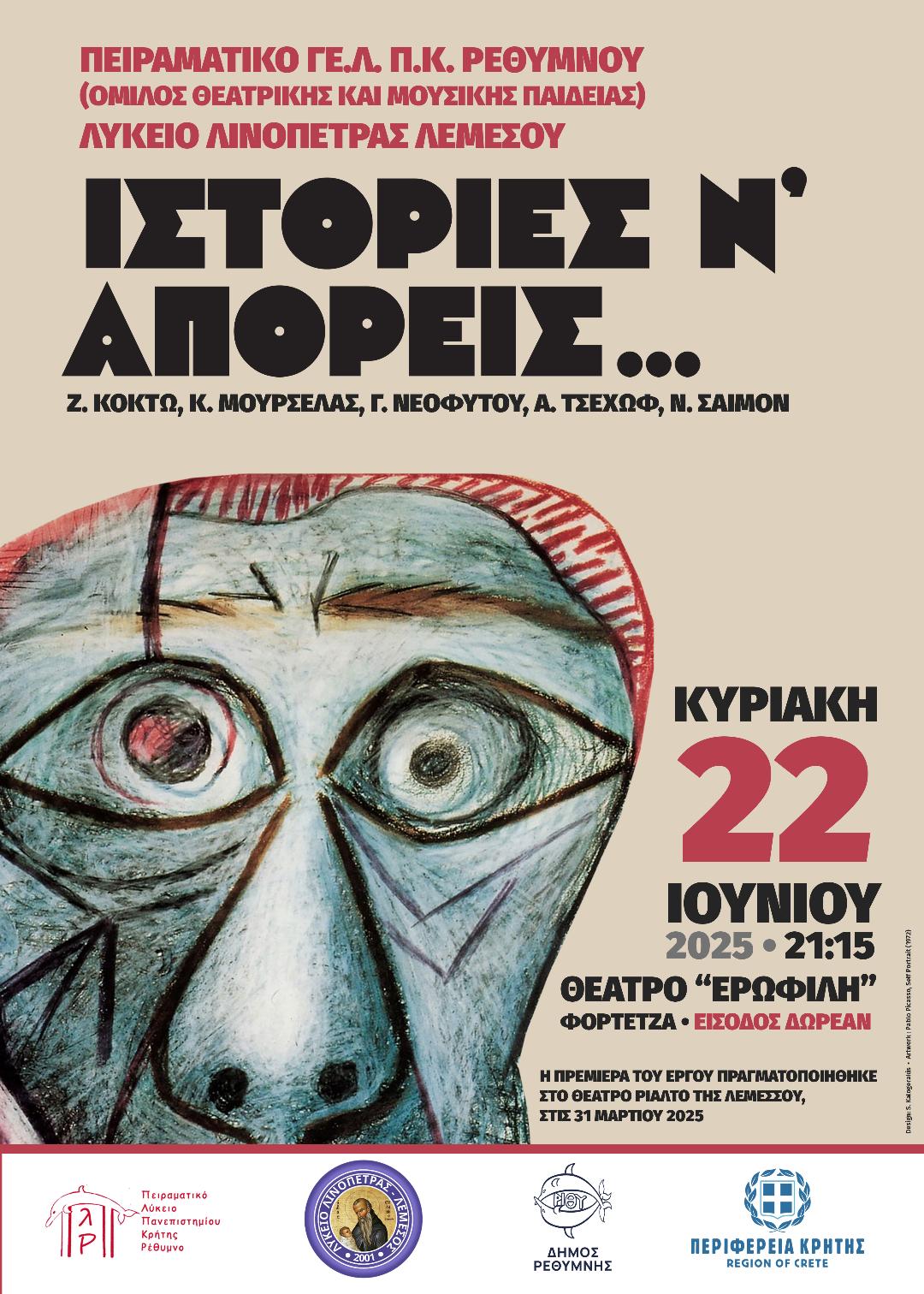 Την Κυριακή, 22 Ιουνίου 2025 και ώρα 21:15 θα παρουσιαστεί στο θέατρο «Ερωφίλη» (Φορτέτζα-Ρέθυμνο), η θεατρική παράσταση "Ιστορίες ν' απορείς!". Πρόκειται για μια συμπαραγωγή που προέκυψε από τη συνεργασία του "Ομίλου Θεατρικής & Μουσικής Παιδείας" (https://dramamusiclub.blogspot.com/) του Πειραματικού ΓΕ.Λ. Ρεθύμνου Π.Κ. με την θεατρική ομάδα του Λυκείου Λινόπετρας Λεμεσού της Κύπρου. Δύο ομάδες που δούλεψαν μαζί με στόχο τη συνδημιουργία μιας κοινής θεατρικής παράστασης και την παρουσίασή της στο θεατρικό κοινό τόσο της Λεμεσού όσο και του Ρεθύμνου. Πρόκειται για ένα σπονδυλωτό έργο βασισμένο σε μονόπρακτα και διασκευές θεατρικών έργων των: Α. Τσέχωφ, Ζ. Κοκτώ, Κ. Μουρσελά, Γ. Νεόφυτου και Ν. Σάιμον. Ένας δημιουργικός "πειραματισμός" που αποτελεί απόπειρα πολιτιστικής συνύπαρξης και αλληλεπίδρασης. Η πρεμιέρα του έργου πραγματοποιήθηκε στο θέατρο «Ριάλτο» της Λεμεσού στις 31/3/2025.